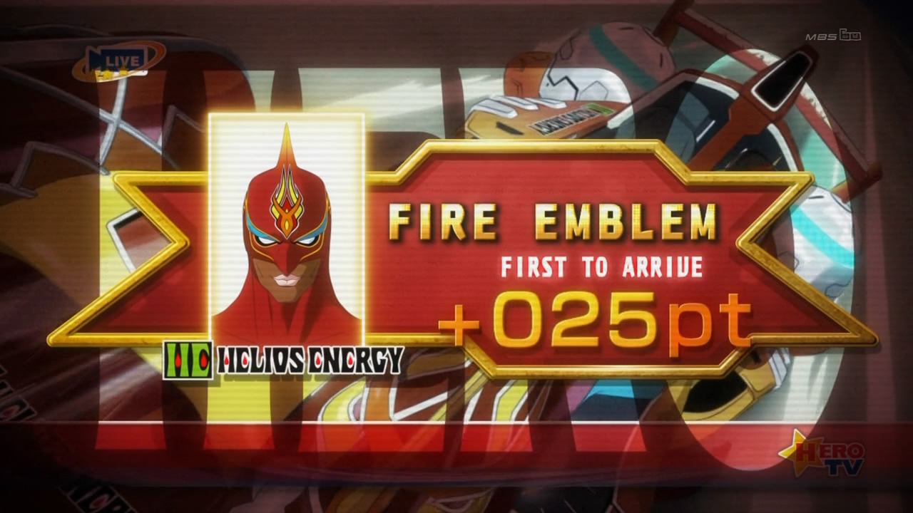 The newscaster brings up the point system and the King of Heroes title.