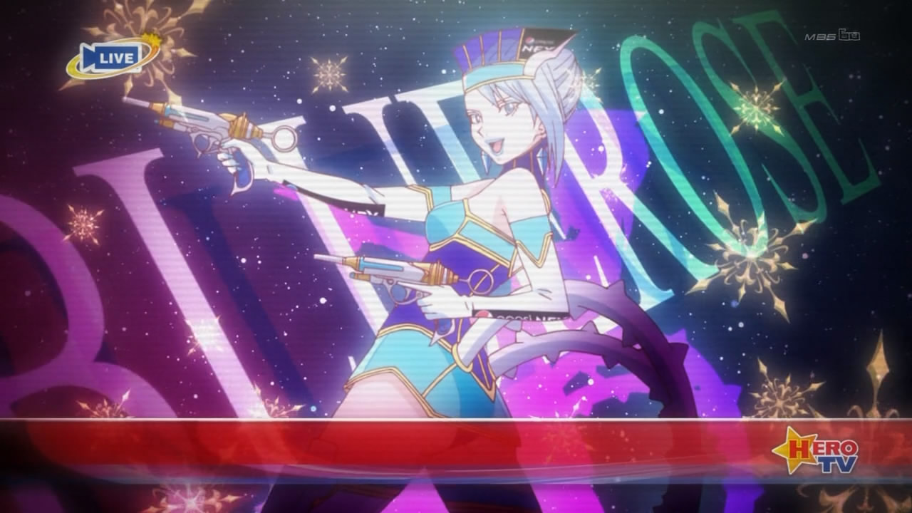 The camera pans over Blue Rose’s arrival pose, and her costume.