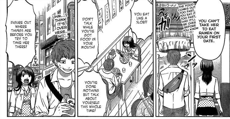 And while unnecessary fanservice-based series like To Love Ru may be horrible examples of how to treat women, there is at least one major shonen title which devotes significant time teaching boys how to treat girls right. Sasuga Kei’s Good Ending, a Weekly Shonen Magazine title which regularly sold in excess of 20,000 volumes, essentially starts out as a clinic on how to handle relationships. The series’ seventh chapter features a practice date almost entirely devoted to correcting basic mistakes men make on dates, vis-a-vis a practice date between male lead Seiji and his relationship coach Yuki. This stands out as exactly the sort of dating/relationship advice manga should be giving.