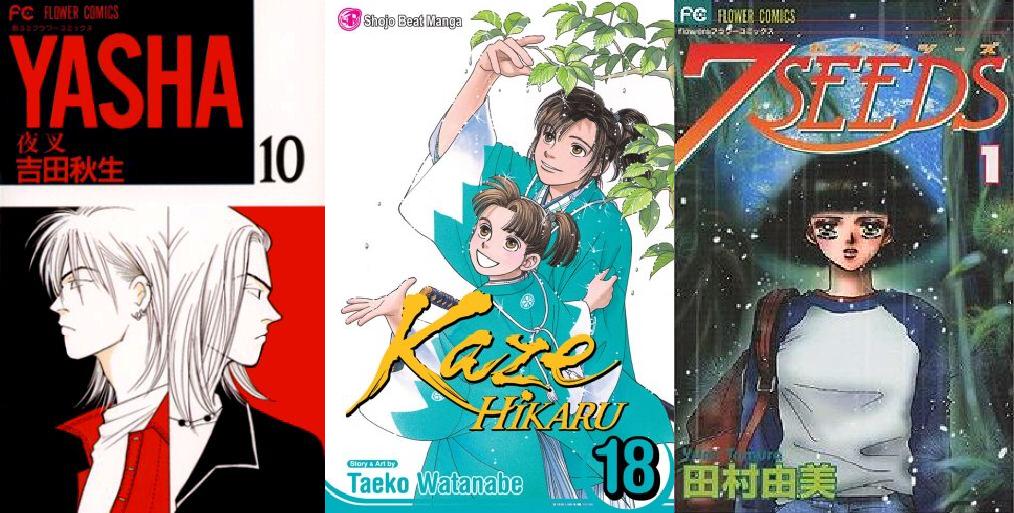 Like a lot of other common perceptions about manga, this one is somewhat misinformed. Before we shoehorn shojo manga into one tiny genre slot, let’s take a look at some names. Akimi Yoshida’s Yasha, a mystery series featuring a young genius scientist working to save the world from a conspiracy led by his evil twin brother. Taeko Watanabe’s Kaze Hikaru, a political and occaisionally violent coming-of-age story dealing with the history of the Shinsengumi. Yumi Tamura’s 7 Seeds, a post-apocalyptic science fiction/survival drama. These aren’t just random series I picked out of a hat, but the cream of the crop; all three are in fact winners of a major publishing house manga award, taking the Shogakukan Manga Award for shojo manga in 2001, 2002, and 2006, respectively. That’s a good 3 of the 13 manga judged to be at the peak of manga targeted towards girls in that decade that have about as little to do with the “traditional” image of shojo manga I outlined earlier. The idea that all shojo manga is a supergenre encompassing only school-life romance is based on an ignorance of basic facts like this one. A quick side-by-side comparison of their covers also puts to bed the notion of a “standard shojo artstyle”: