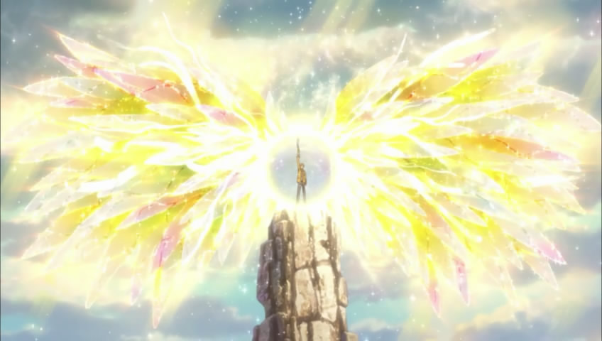 The whole Arata-Kadowaki fight this episode was a microcosm of the show, as we watched Arata go from being beaten down to confident, worthy wielder of immense power. Since this was taking place on a shorter timescale, that made it a lot less subtle, what with the raising a continent from the sea and the golden angel wings and all.