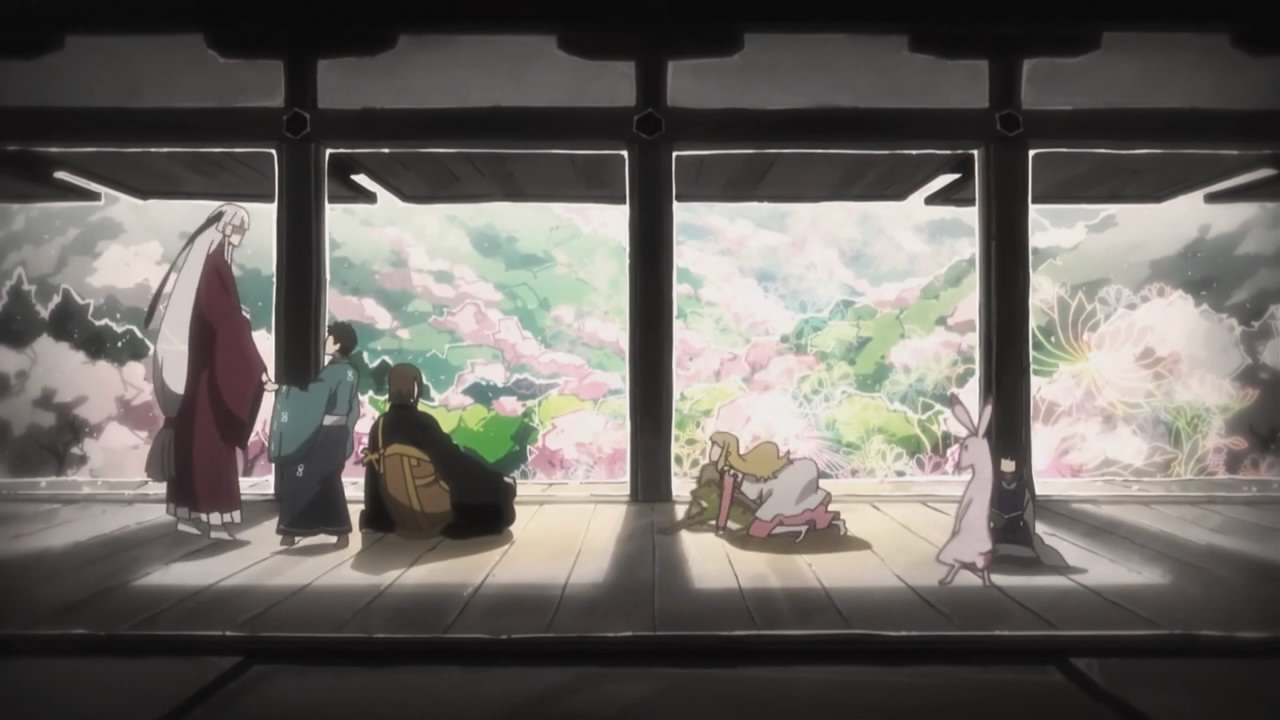 Drew: I can understand the need to have more defined grounding in a story, but on the other hand, I kind of enjoy the mystery inherent in an environment that isn’t fully explained. I feel that the two offer distinctly different appeals. For example, Un-Go was a mystery show that got ragged on as a crappy mystery because most of the stories were explained in one episode. It still did things with the stories themselves, but I’ve talked with several people who didn’t like not being able to try to solve it. I think it’s that same sensation, but on a macro scale. There’s a difference between a mystery that eventually gets explicitly solved, a mystery that gets solved in the background, and a mystery that’s left open. I’d say Kyousogiga is the second type, so I’m perfectly satisfied with the background information we got, especially in the fifth episode’s musical montage.