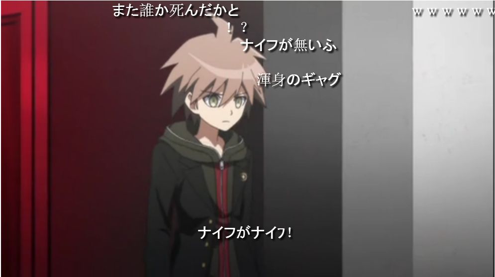 When Naegi was entrusted with the very deadly-looking (but really no more deadly than a kitchen tool) knife, I had a fair degree of suspicion it was getting taken. What I wasn’t expecting was the multiple video commenters who made the very pregnant “Knife ga naifu!” pun.