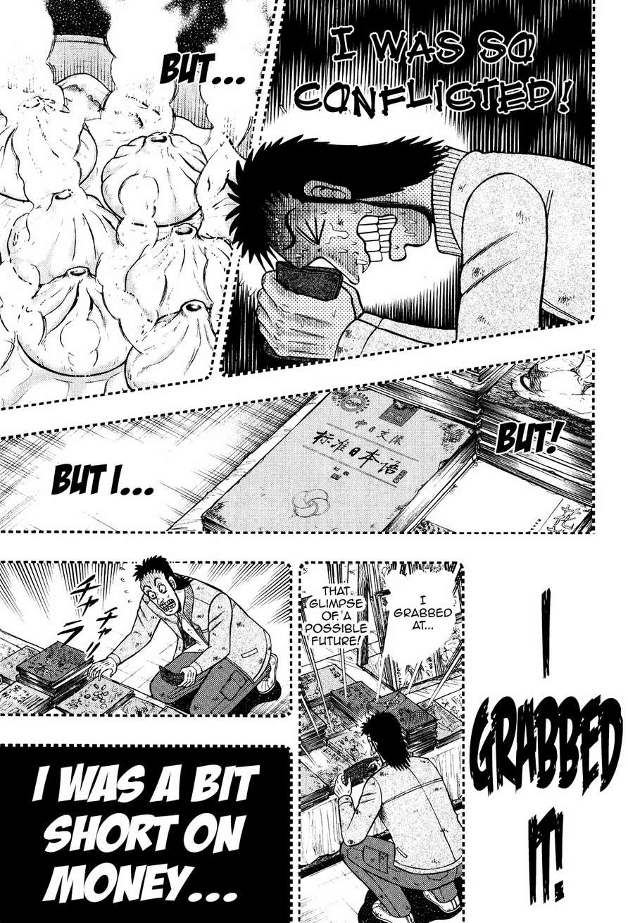 Chang, born as an illegal second son to parents who were already poor, seems to be stuck into a life of cheap, forced labor not unlike the work Kaiji himself was forced to do in part 2. Feeling the burden of a short, cheap life ahead of him, he gradually becomes fixated on a faint hope; emigration to Japan, where he could earn a year’s salary in a fraction of the time and use it to carve out a better life for himself. However, there’s a huge obstacle in the way of that hope: he doesn’t speak Japanese. One day, he gets some free time in town, and, before he’s about to blow his savings on some very lip-smacking food, he notices a Japanese textbook out of the corner of his eye: