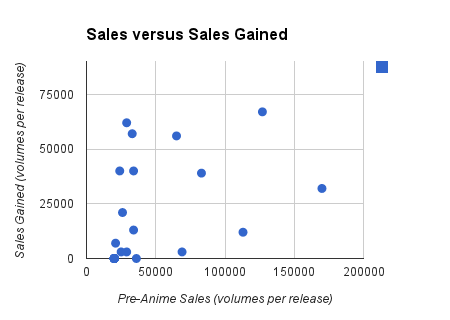 There’s not much of a strong correlation here. While those with moderately higher pre-anime sales do seem to fare slightly better, there’s not a very strong in this plot. The series with the highest sales level pre-anime produced fairly modest gains, whereas multiple series selling under 50,000 volumes saw their sales level jump by over 50,000.