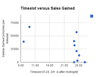 There seems to be a weak correlation with more MAL popularity, and a somewhat stronger correlation with MAL ranking. While it’s by no means absolute, it’s very clear that the one ranked 1500th or higher* were the ones that produced all the big gains in manga, and there’s almost no gains in the adaptations that ranked 2500th or lower. That’s actually extremely interesting. While I’d have to look into it some more to get the full picture, I’d suspect that there’s something to that. It’s quite plausible that a show that’s trying to sell something, like a good salesman, can’t just get people to notice its product; it needs to get people excited about it, especially relative to the rest of the field.