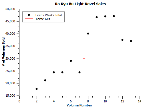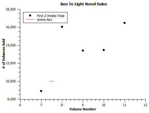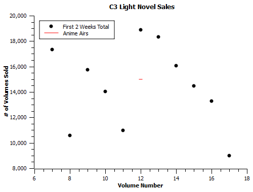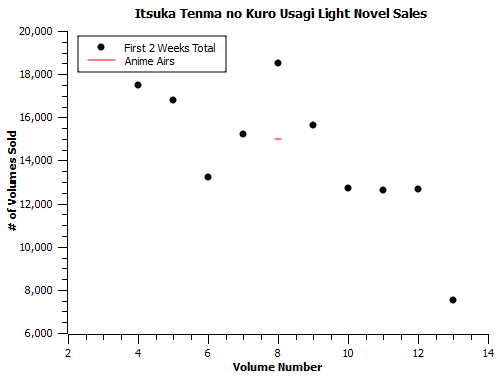 -Novels for which I could confirm a change in sales averaged about 20,000 additional copies per volume in the wake of an anime. Every running series except R-15 (never charted), Dragon Crisis, and Itsuka Tenma no Kuro Usagi got a boost of around 5000. This is, perhaps somewhat surprisingly, a greater percentage of series to get something than manga produced over the 2011-2012 period, where roughly half of the sample of adaptations produced an increase in volume sales very close to zero.
