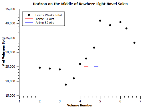 -Horizon on the Middle of Nowhere’s boost took a bit longer to show than most, but that’s likely because its readers had significantly thicker books to power through. This case may be similar in principle to how 20-year-old JJBA was the one series to not see any manga sales increases in 2011 and 2012 in spite of both a high mal ranking and megahit disk sales.