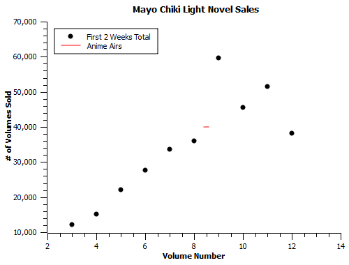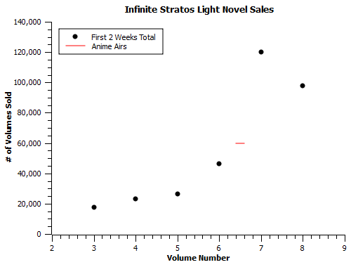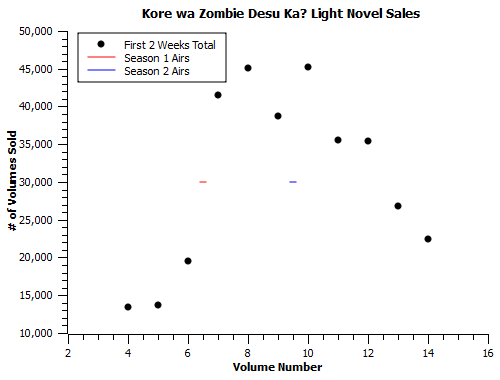 Note: I plot the two-week totals, rather than the one-week total, because even the average the first week total is vulnerable to a series that comes out on the last of the Oricon tracking period and having its sales numbers hamstrung. Kore wa Zombie Desu Ka had 4 volumes in a row come out on the last day of the week, obscuring a very real anime-fueled boost in sales.