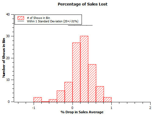 So, for the 101 series with non-reboot TV sequels that I had sales data for, the average dropoff of sales was 20%, with a standard deviation of ±31%. That means that shows experiencing a dropoff from anywhere to negligible to 50% are experiencing an “average” level of dropoff. Of the 101 series in the sample, 77 fell somewhere within this range.