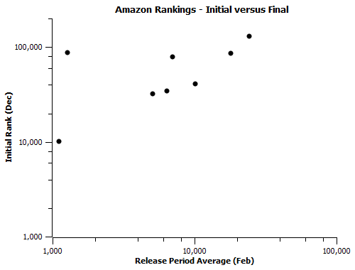 Take out the RN RE datapoint in the upper-left corner (it wasn’t discounted when the initial data was taken), and the correlation of initial and final ranking is fairly straightforward, though not entirely linear. This suggests it might be somewhat fair to cite the current amazon rankings of releases scheduled a couple months in advance as a relative measure of interest.
