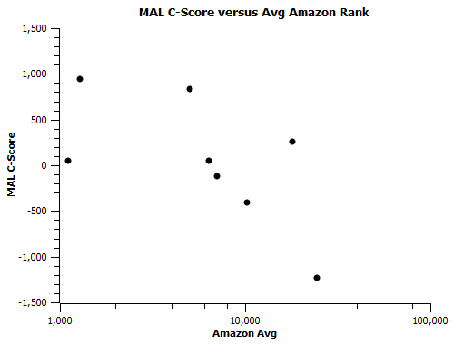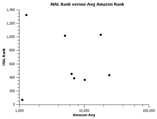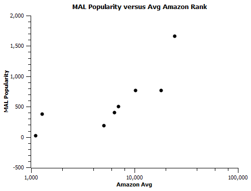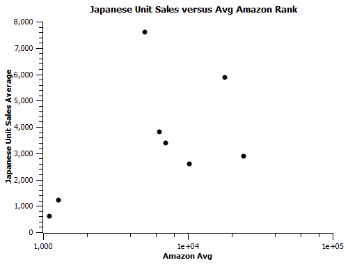 Note 2: Said amazon ranks will be averaged over a 3-day period centered on the release date and plotted logarithmically; while it would be foolish to assume too much similarity with their Japanese counterparts, it’s reasonable to assume the general principle amazon stalker uses that the difference between 2000th and 3000th is more meaningful than the difference between 12000th and 13000th, if US amazon rankings are at all top-heavy.