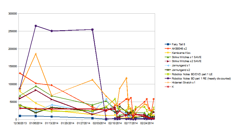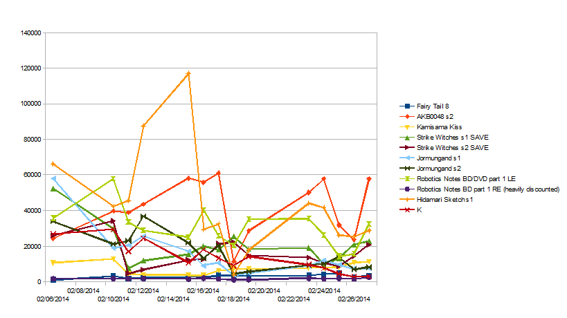 It’s not an absolute trend, but it does seem like the release days (every Tuesday, or Feb 11th, 18th, and 25th) tend to yield a boost for most titles on the list, not just the titles coming out on that particular day. If not just a coincidence, this is easily explicable as a foot-in-the-door effect; people who buy box sets of anime aren’t just buying one over their entire lifetime. If they’re interested in multiple series, it makes sense that they’d be more likely to drop $40 on a series while already on the site to buy another one.