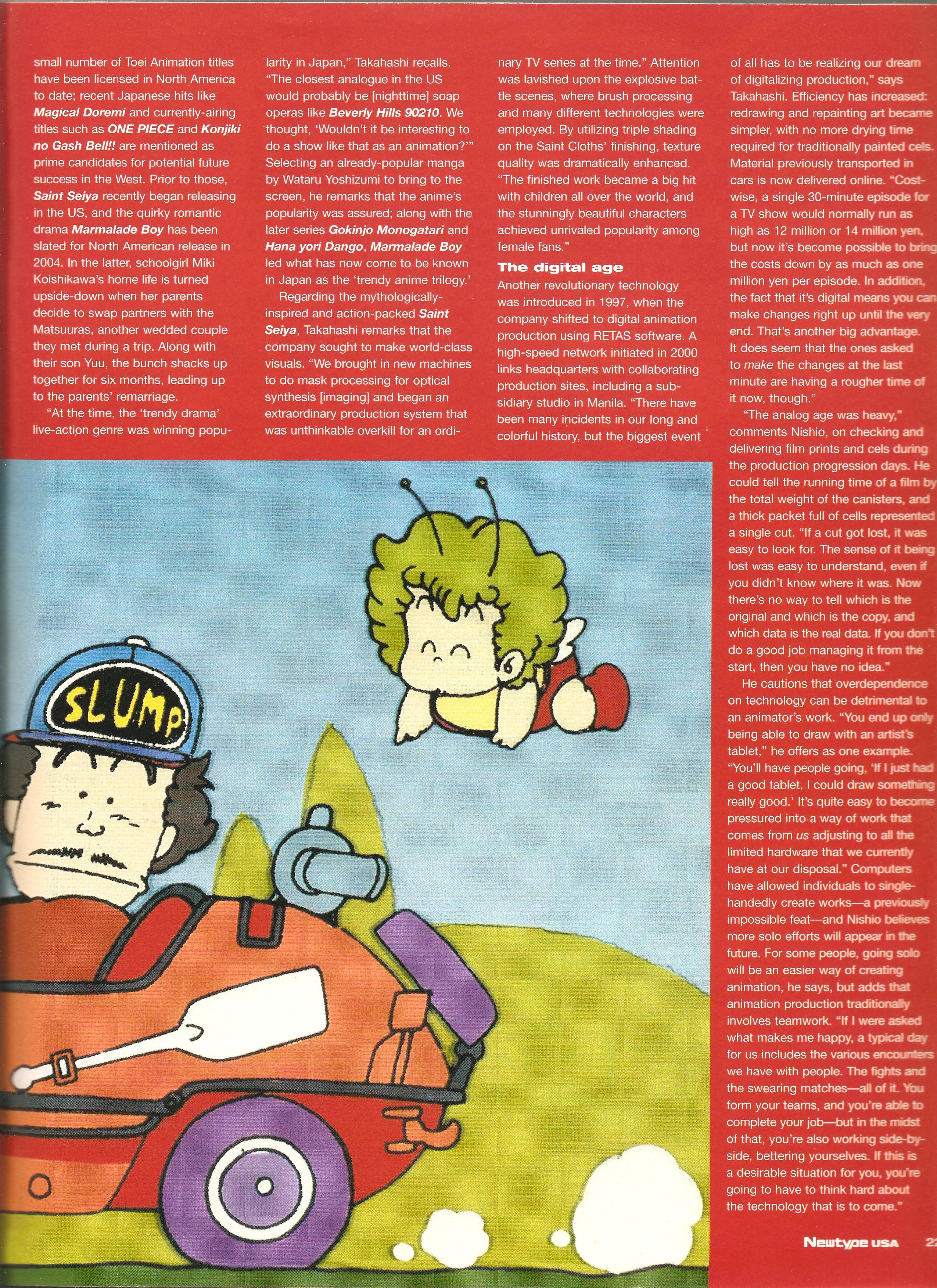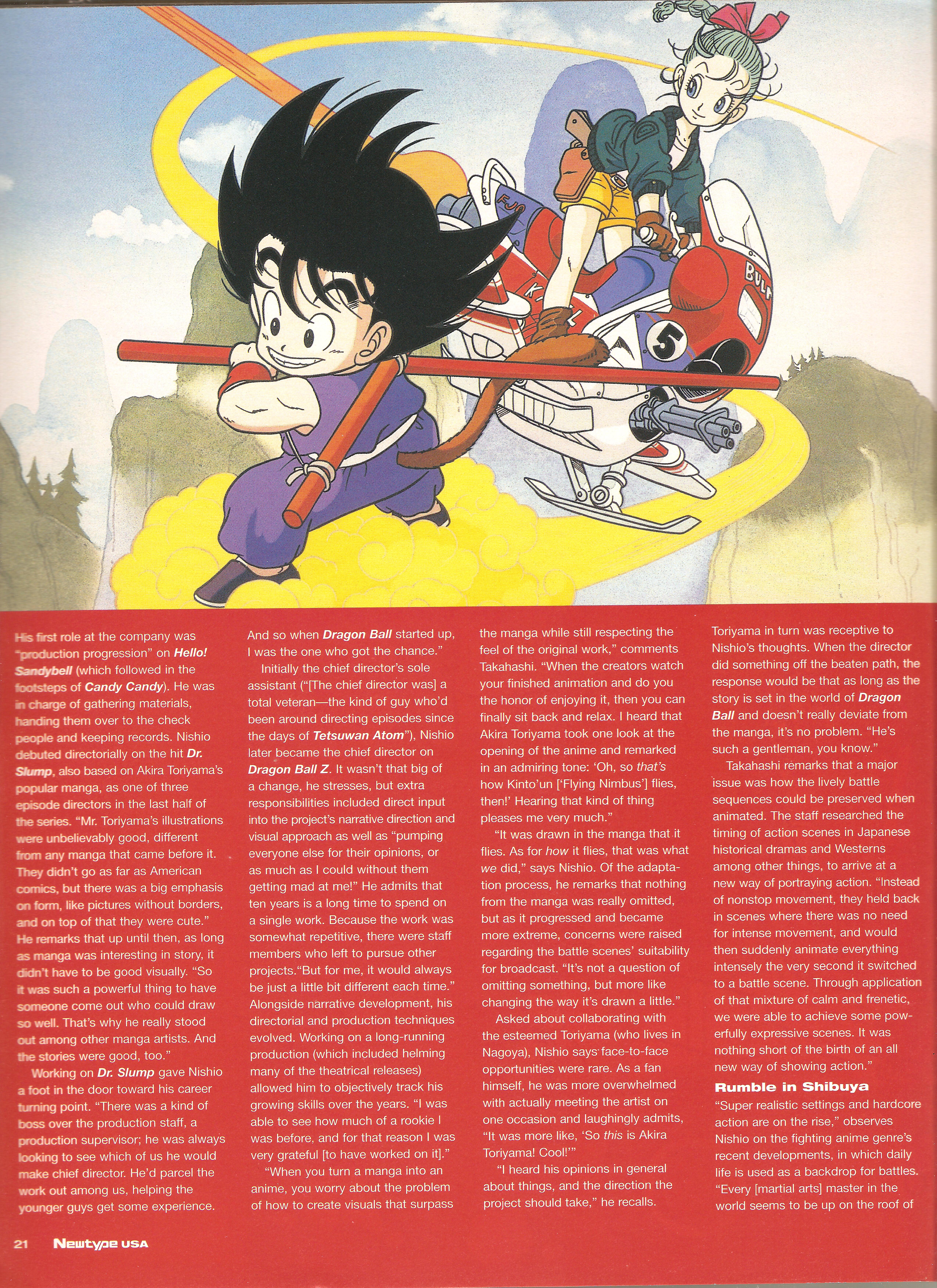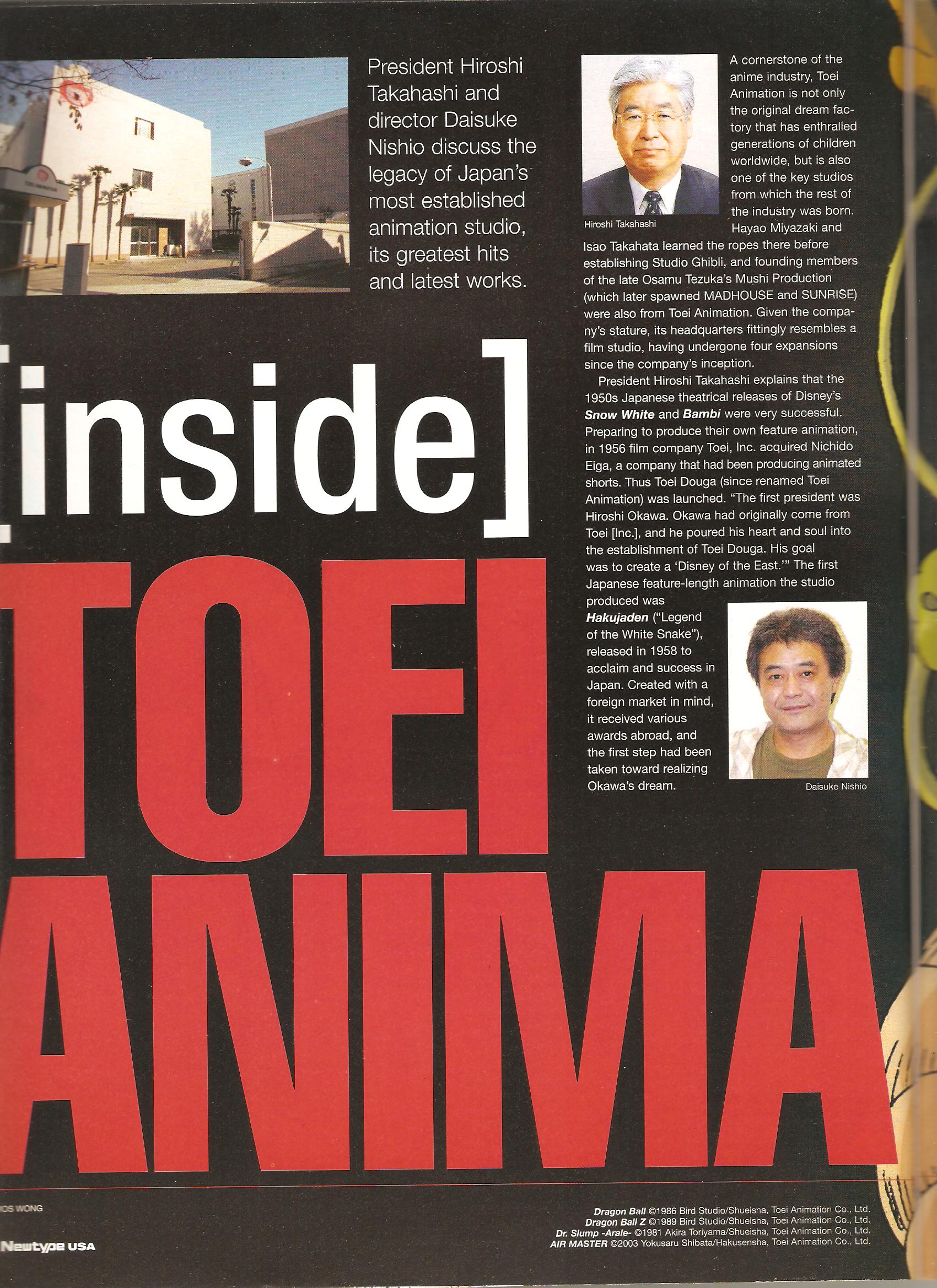 Along with an understanding of the broader context of the subject, the most vital ingredient to good anime coverage is a reliable source. So when US journalists actually interview people on the production side in Japan, it’s generally worth noting unless the interview consists entirely of fluff. This is the second of what will (hopefully) be several posts over the next couple of weeks archiving articles from Newtype USA’s [inside] series of articles written by Amos Wong. It contains comments from President Hiroshi Takahashi and Director Daisuke Nishio on researching how to best portray action sequences, overseas sources of income, and the pluses and minuses of the transition from analog to digital animation.