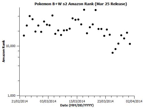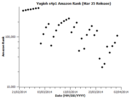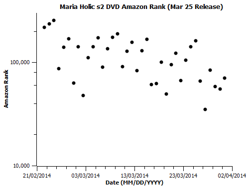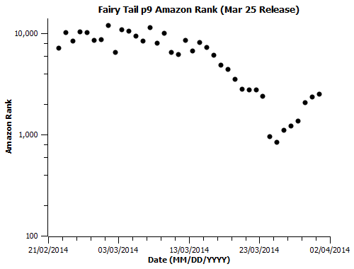 This is the last individual/plot post I’ll be doing for the March US releases I’ve been tracking. The full sheet of data is available here. I’m doing tracking for several April releases as well, and will continue to do so so long as there look to be more questions worth the daily effort of collecting the figures. An analysis post, comparing some of the narratives I touched on earlier with the new data, discussing other points to attack with a sample that will continue to grow, and making very, very tentative factor-of-two sales estimates based on extrapolation from somewhat known low-end and high-end daily totals will (hopefully) be up sometime this week. Speaking of the low-end, here’s the last chart for the performance of that Aria the Natural release: