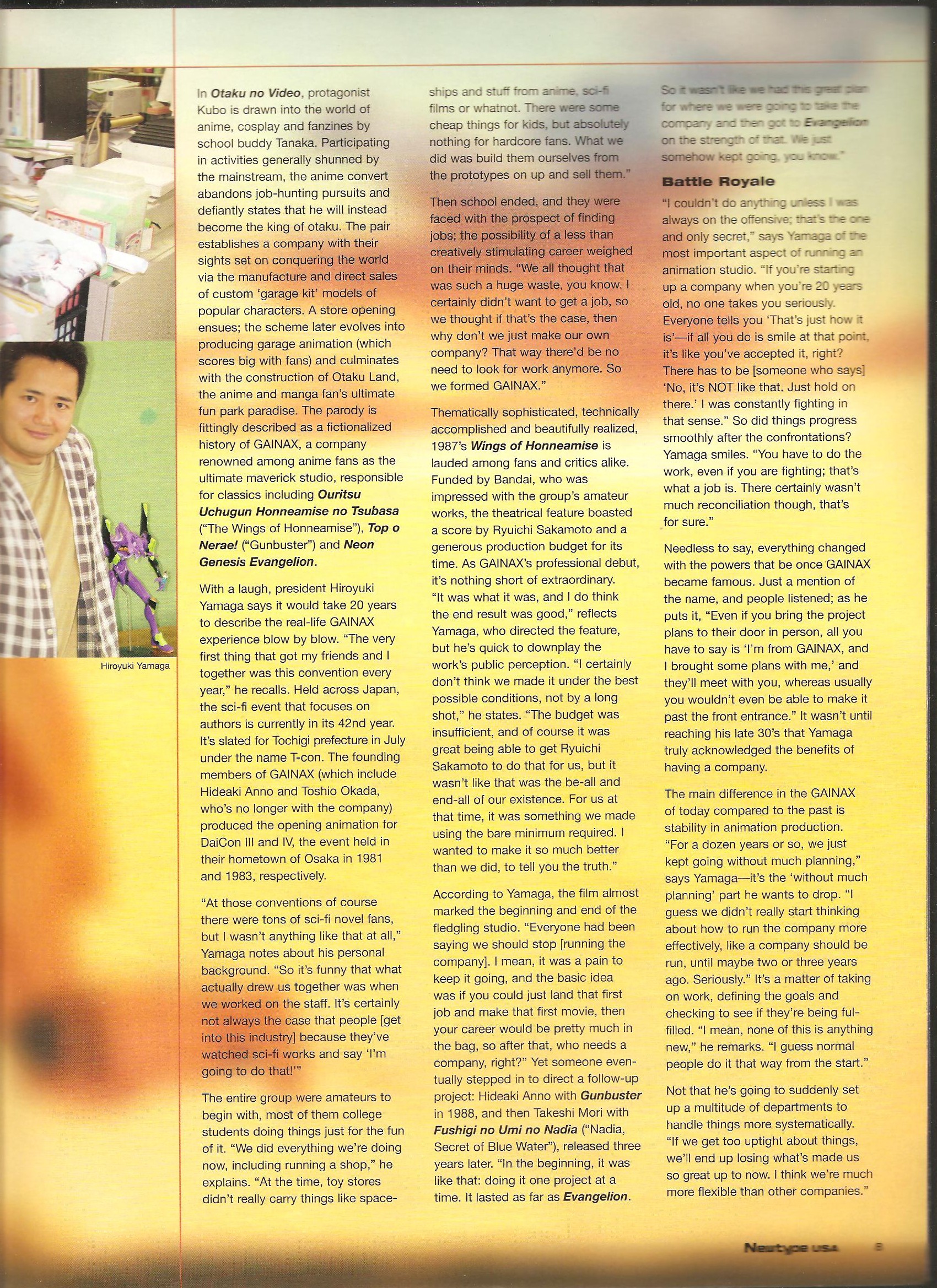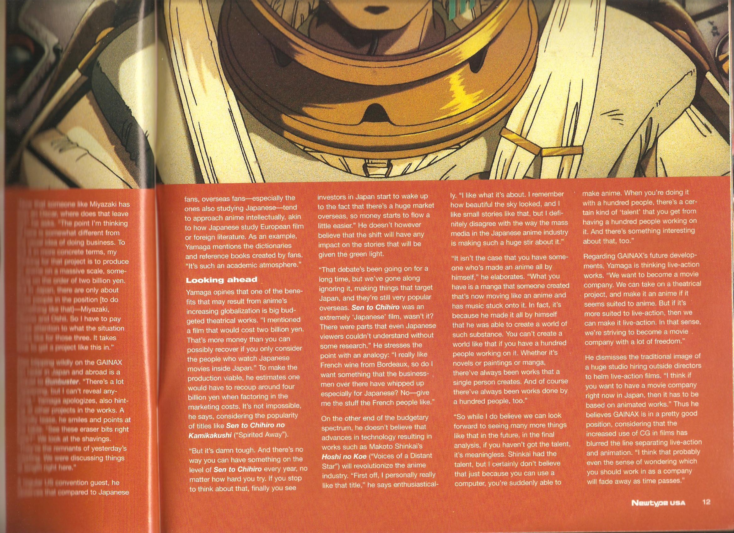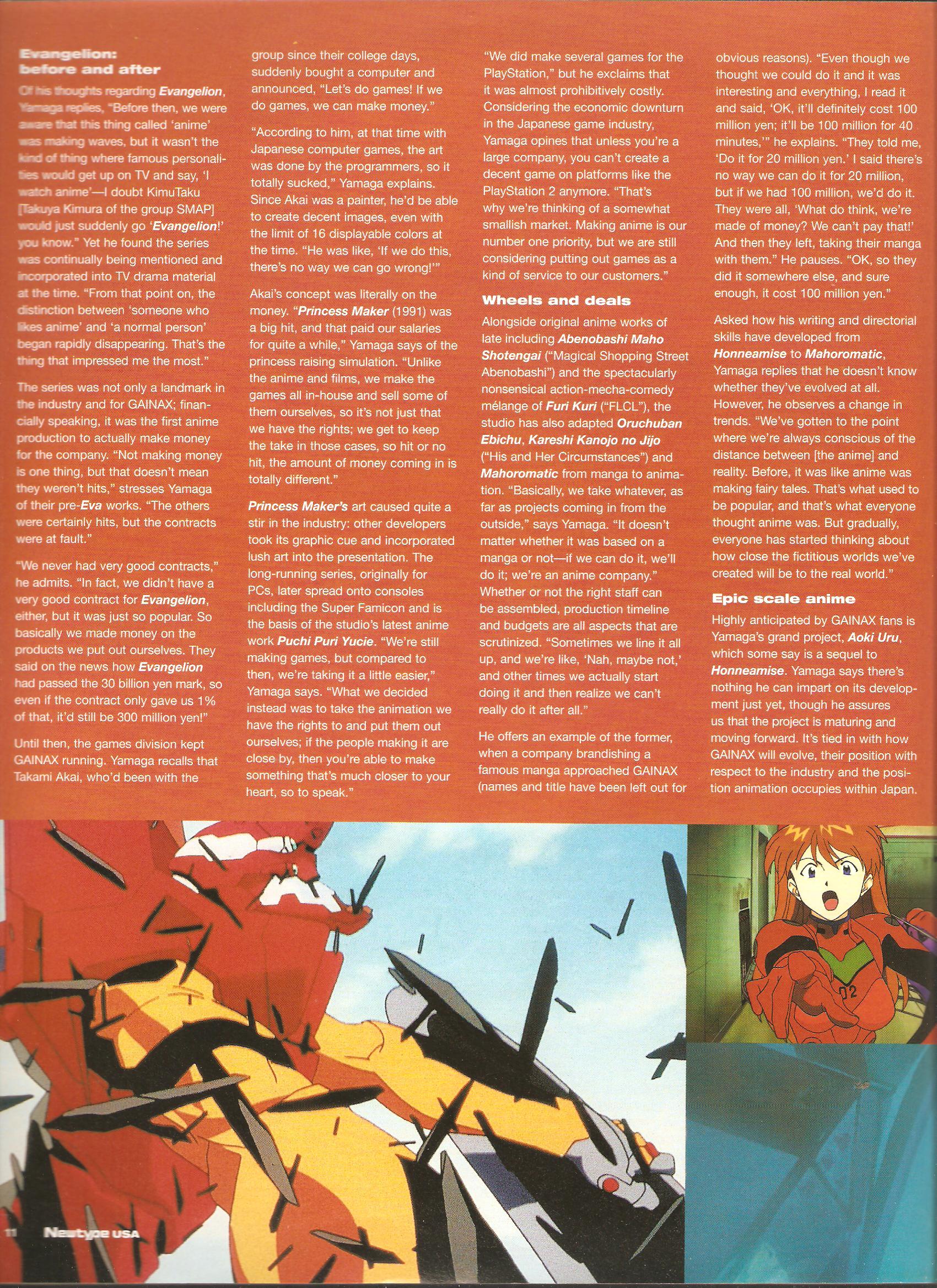 Along with an understanding of the broader context of the subject, the most vital ingredient to good anime coverage is a reliable source. So when US journalists actually interview people on the production side in Japan, it’s generally worth noting unless the interview consists entirely of fluff. This is the third of what will hopefully be a couple more posts archiving articles from Newtype USA’s [inside] series of articles written by Amos Wong. This one features Gainax president Hiroyuki Yamaga on beating game companies in their own arena to stay afloat financially, seeing Eva mentioned in pop culture, and his opinion on the best way to target overseas fans.