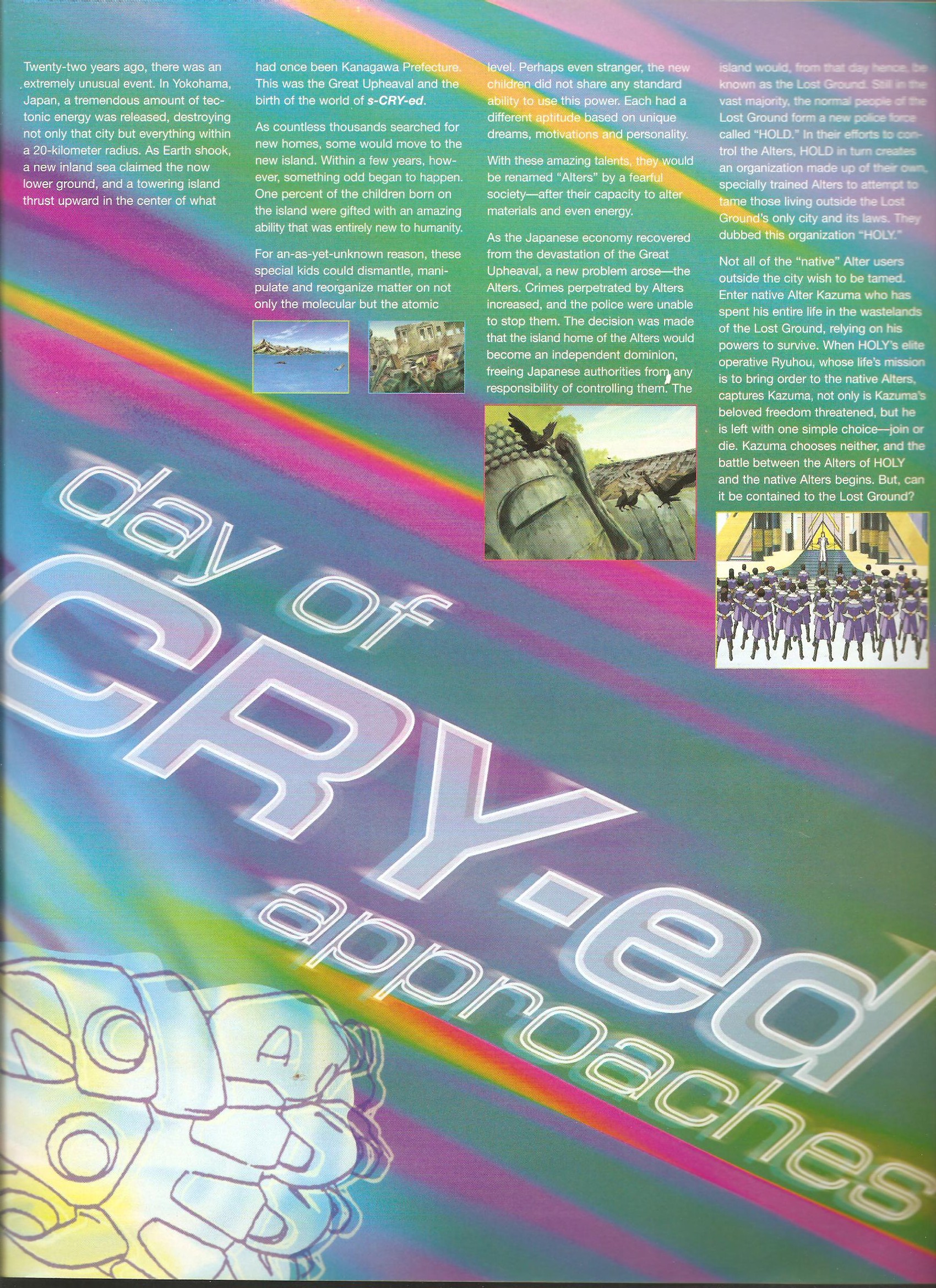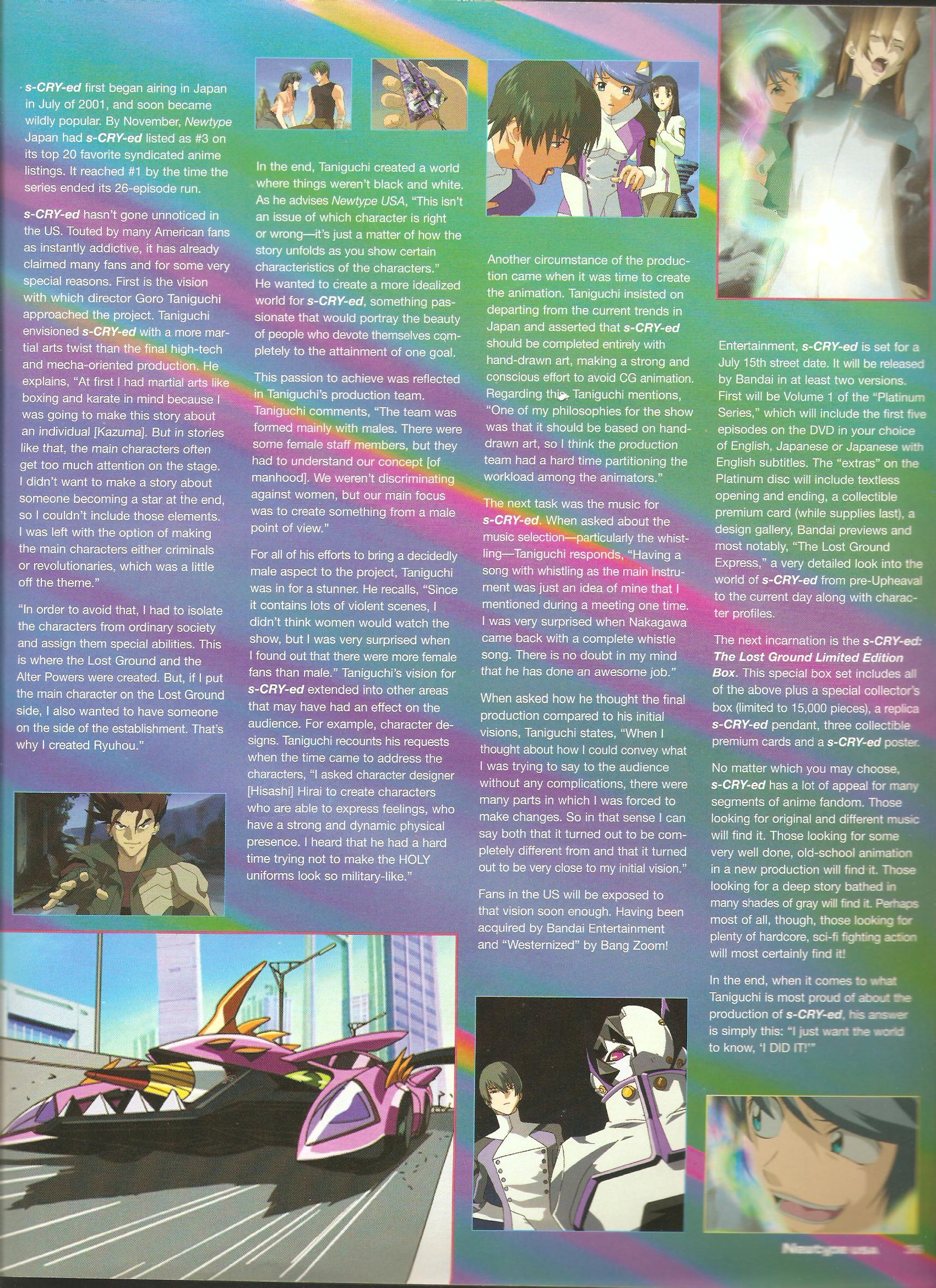 I’ve been collecting a bunch of old Newtype USA issues off of ebay lately, with the goal of eventually uploading scans of most or all of the [inside] series. The next batch arrived at my apartment yesterday, and in addition to an article on Gainax with an offhand mention of mid-90s OVA budgets, it contained this feature on s-CRY-ed with a number of comments directly from Taniguchi Goro. Even though there’s not a lot of historically notable material in there, there’s interesting s-CRY-ed specific stuff; focusing on hand-drawn art against current industry trends, struggling to translate the core concept into a coherant final story, being surprised that a series he tried to make as manly as possible ended up with a majority female fanbase, and the offhand comment that turned into the OST track In His Memory. It’s something I personally enjoyed reading, as a huge s-CRY-ed geek. Scans are after the jump (statements from Goro are all on the fourth page).
