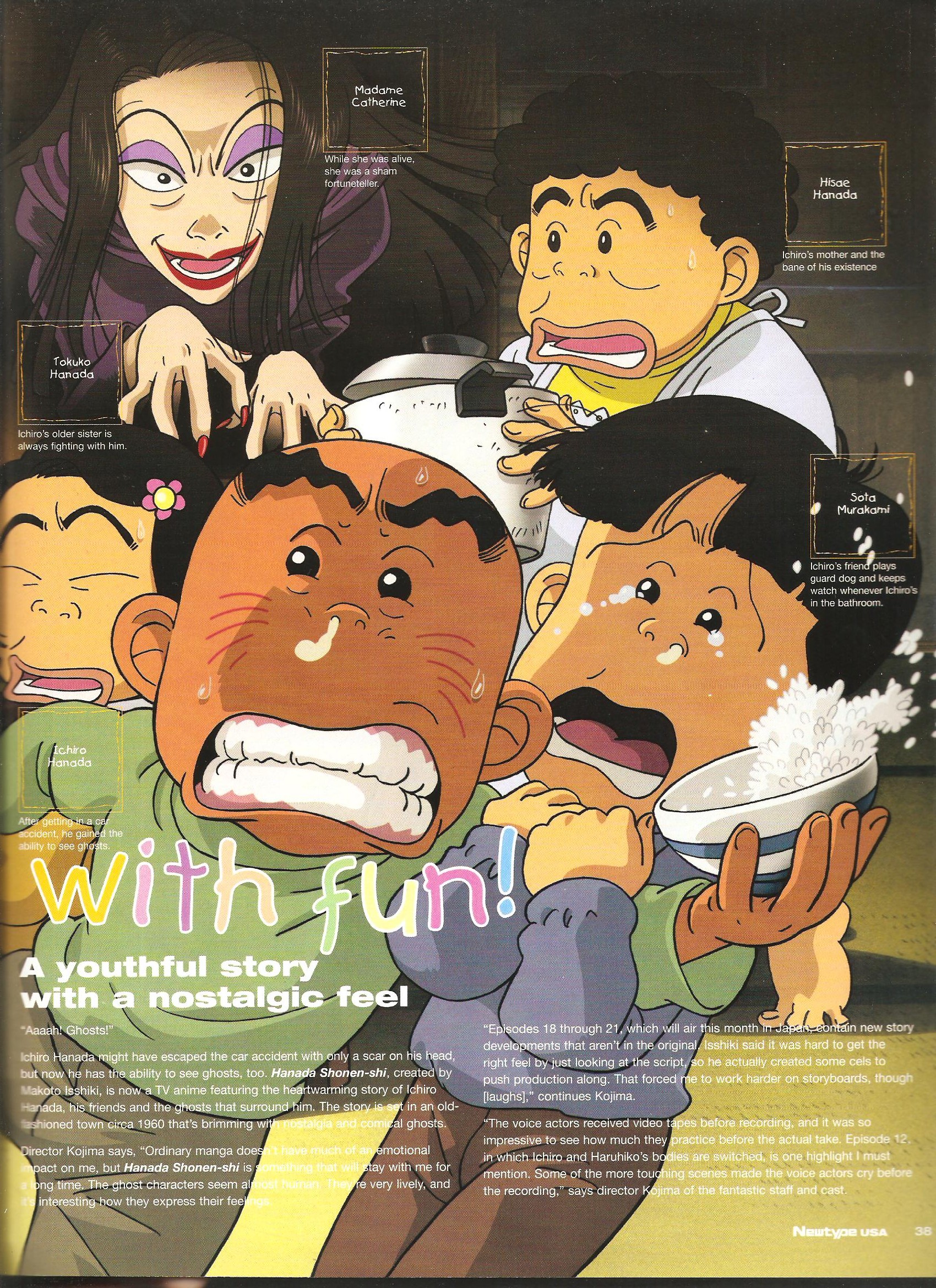 Hanada Shonen-shi is an oft-overlooked series that holds a few unique fun-trivia attributes; it was one of the earlier shows in the awesome NTV 24:50 Tuesday slot and put up 3%+ ratings long before doing so was cool, and it’s got the only opener done by the Backstreet Boys. This brief spread talks about how the manga creator, Makoto Isshiki, was the one who pushed for that opener. There’s also an interesting comment on the voice actors practicing for a body-swap sequence. Not much text, but it’s neat.