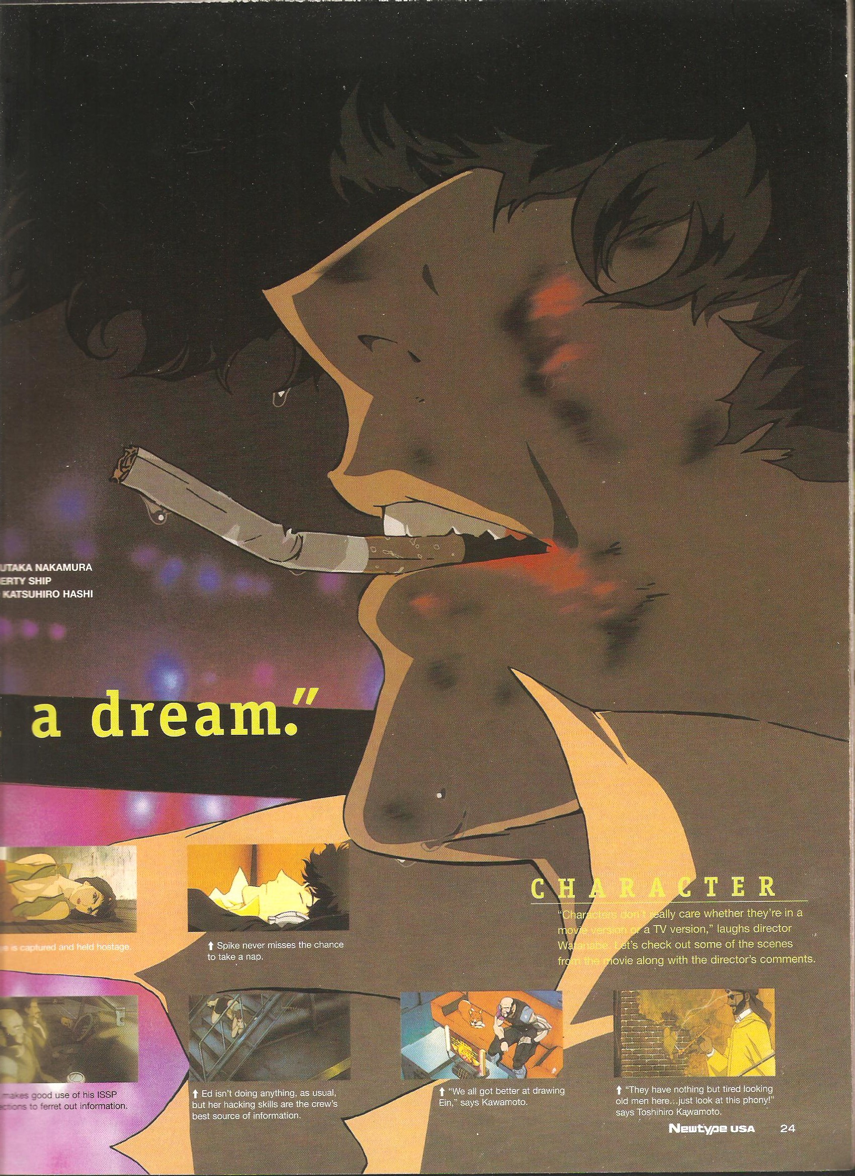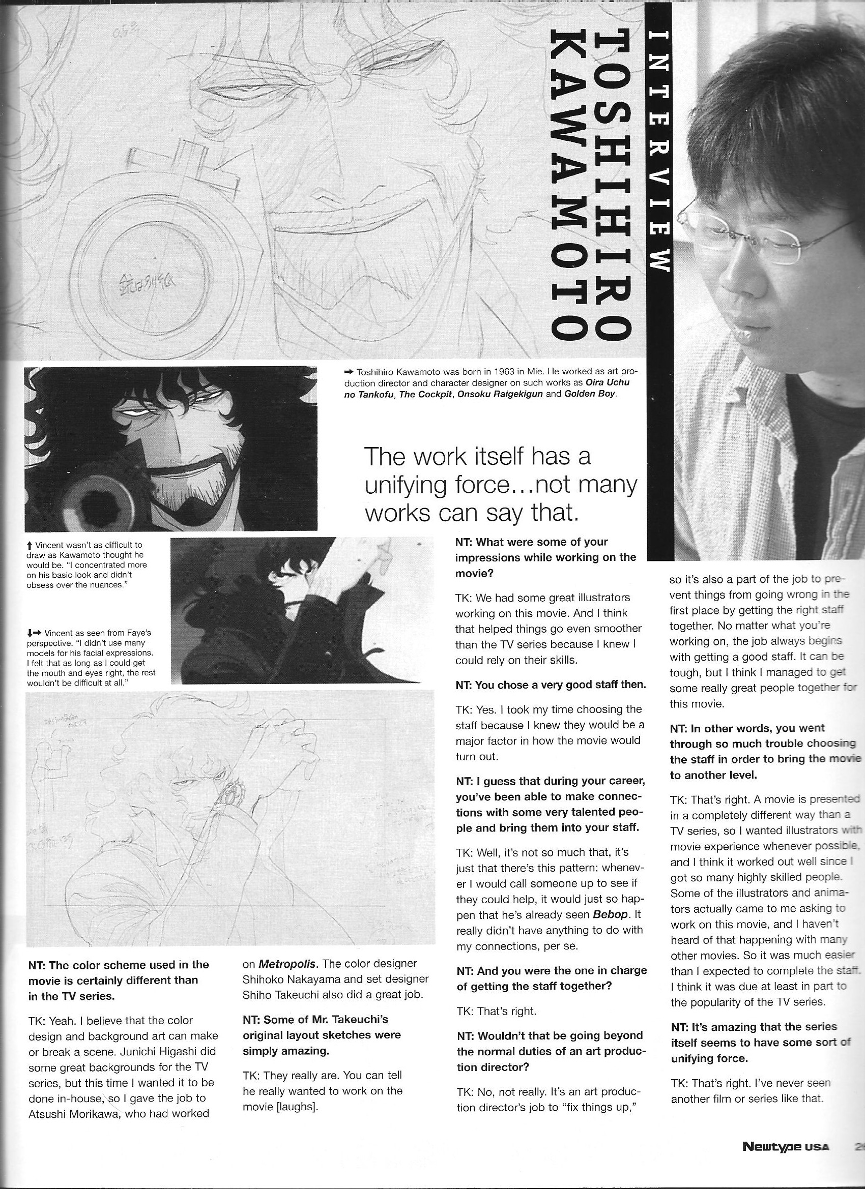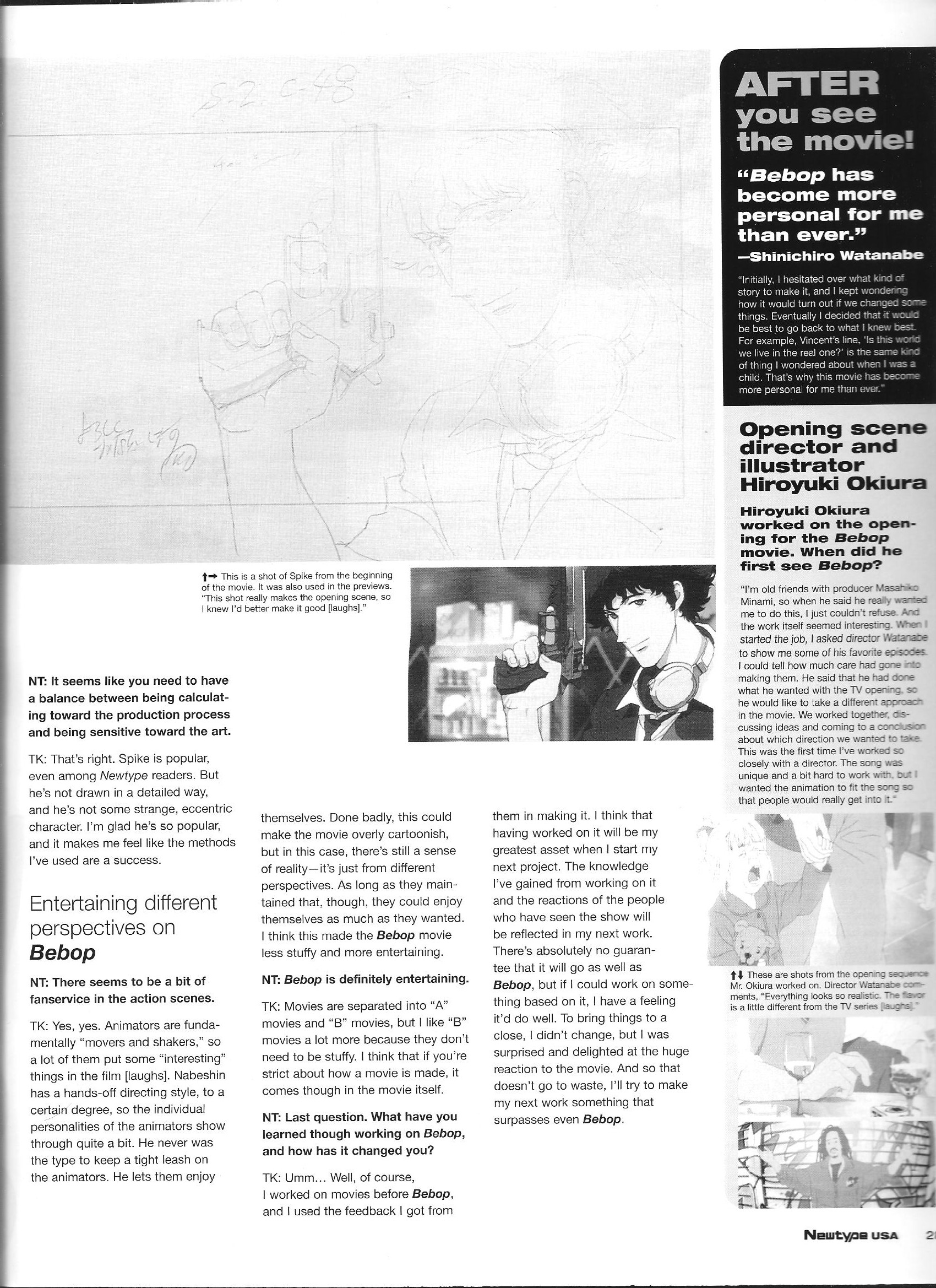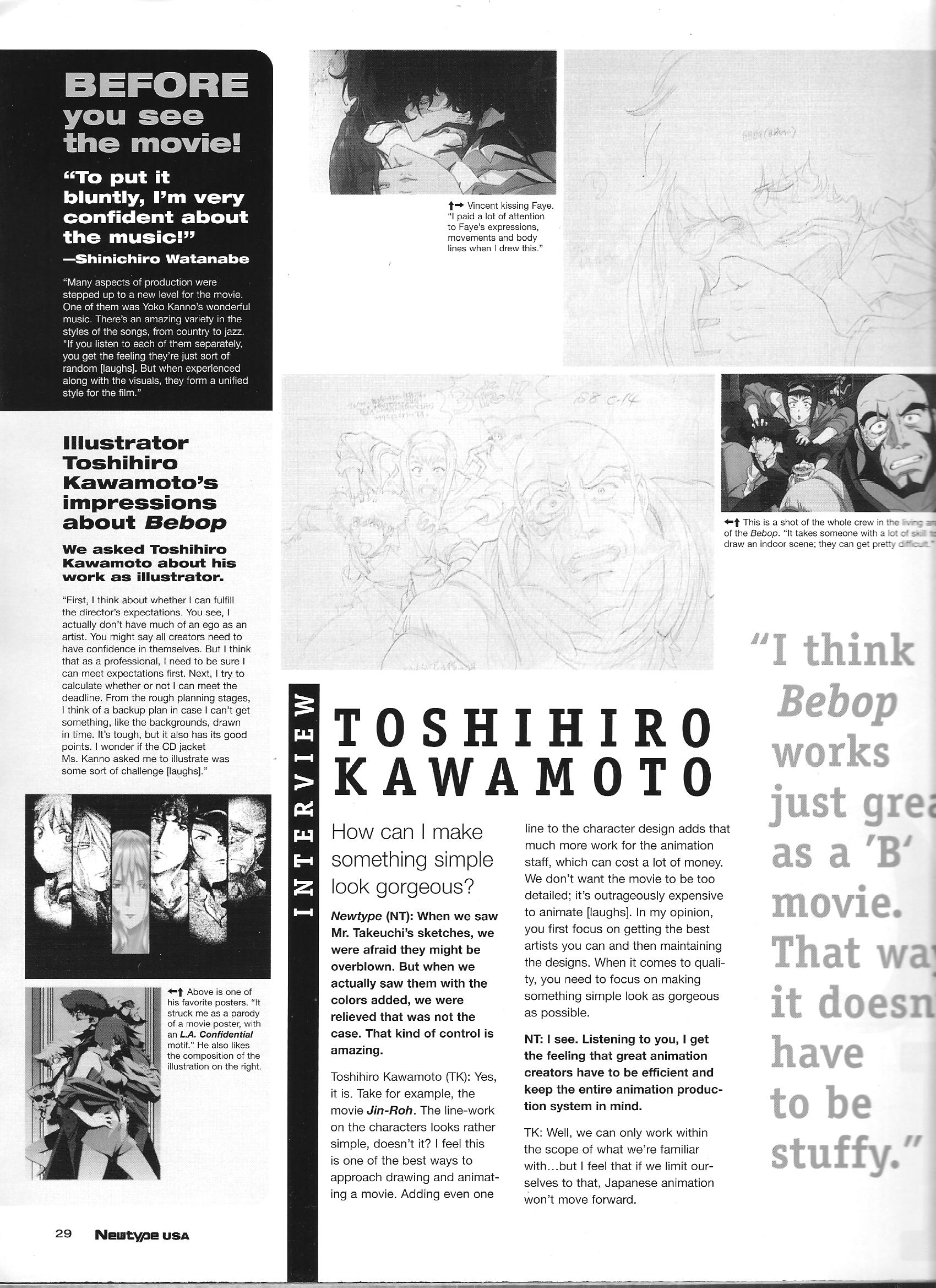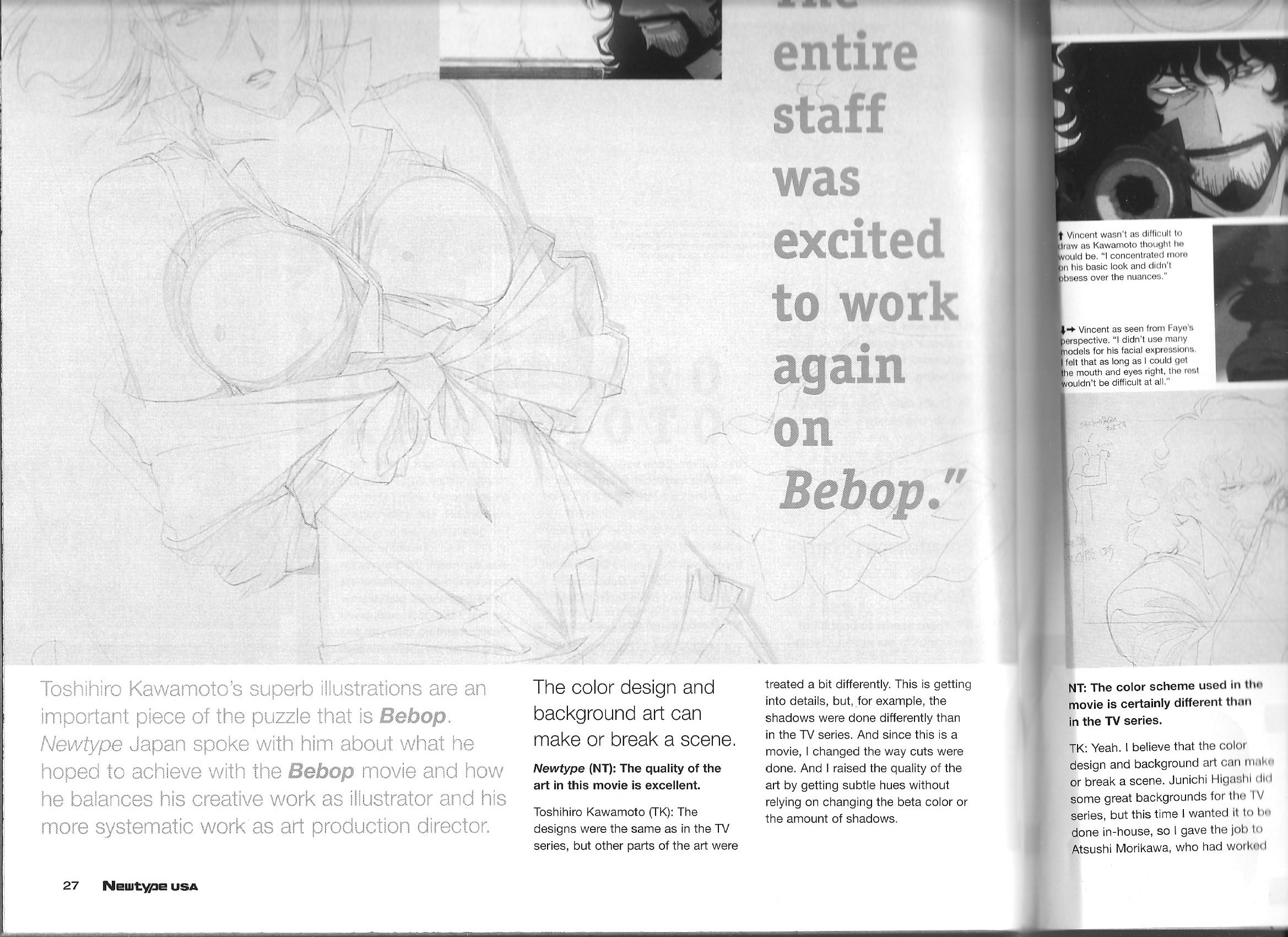 I wasn’t planning on scanning this until I read it, but this one just so happened to contain some juicy tidbits. Toshihiro Kawamoto not only opens up a little about what the job title “Art Production Director” entails, and has a cool point about the cost of extra lines in character designs for anime movies (the more times you have to draw it, the more expensive it gets). He also mentions that Shinichiro Watanabe tends to be more hands-off in handling his staff, hence some of the fanservice in the motion-heavy scenes (in other words, kind of an entertaining polar opposite to Tsutomu Mizushima in 2012).