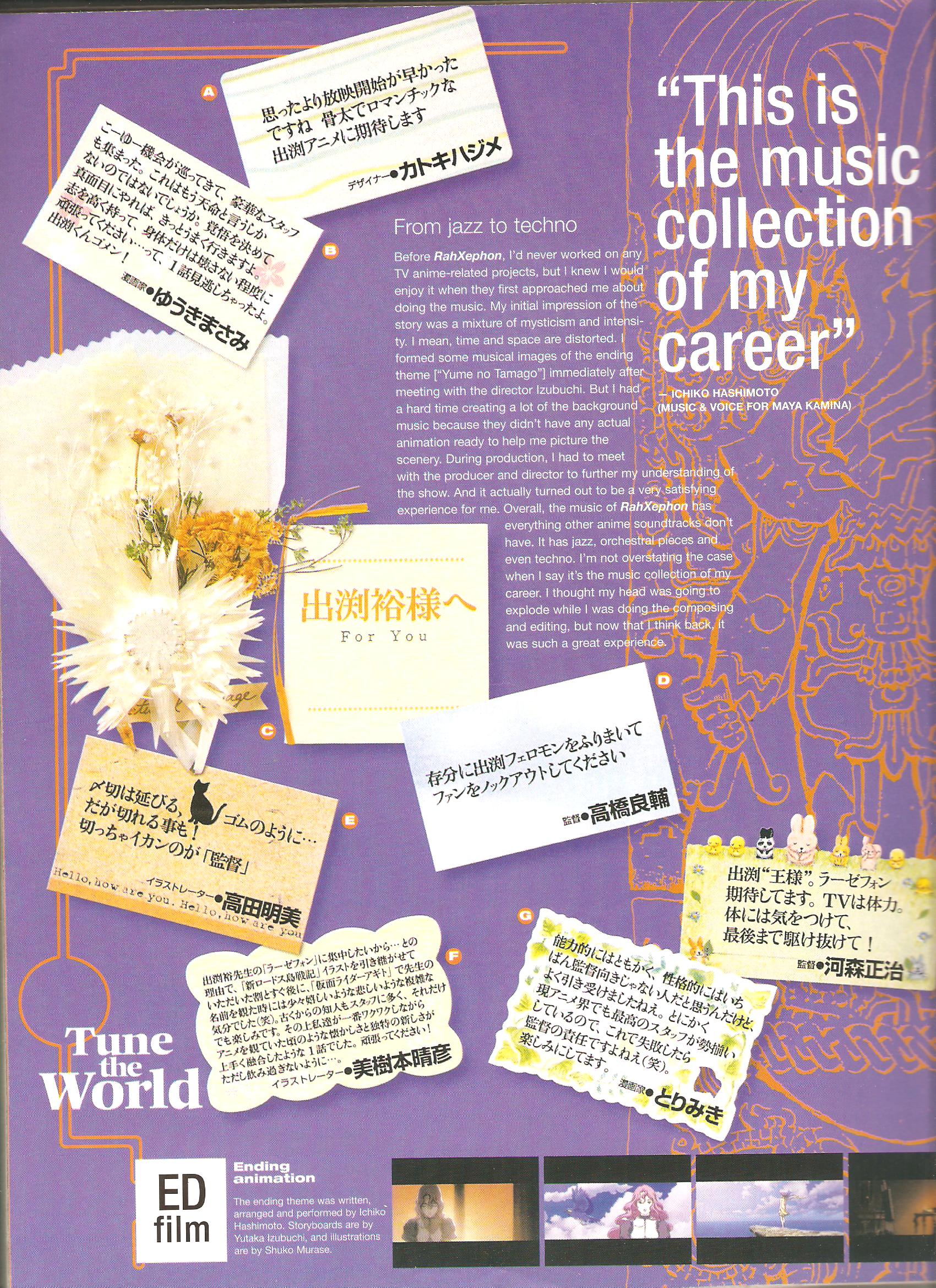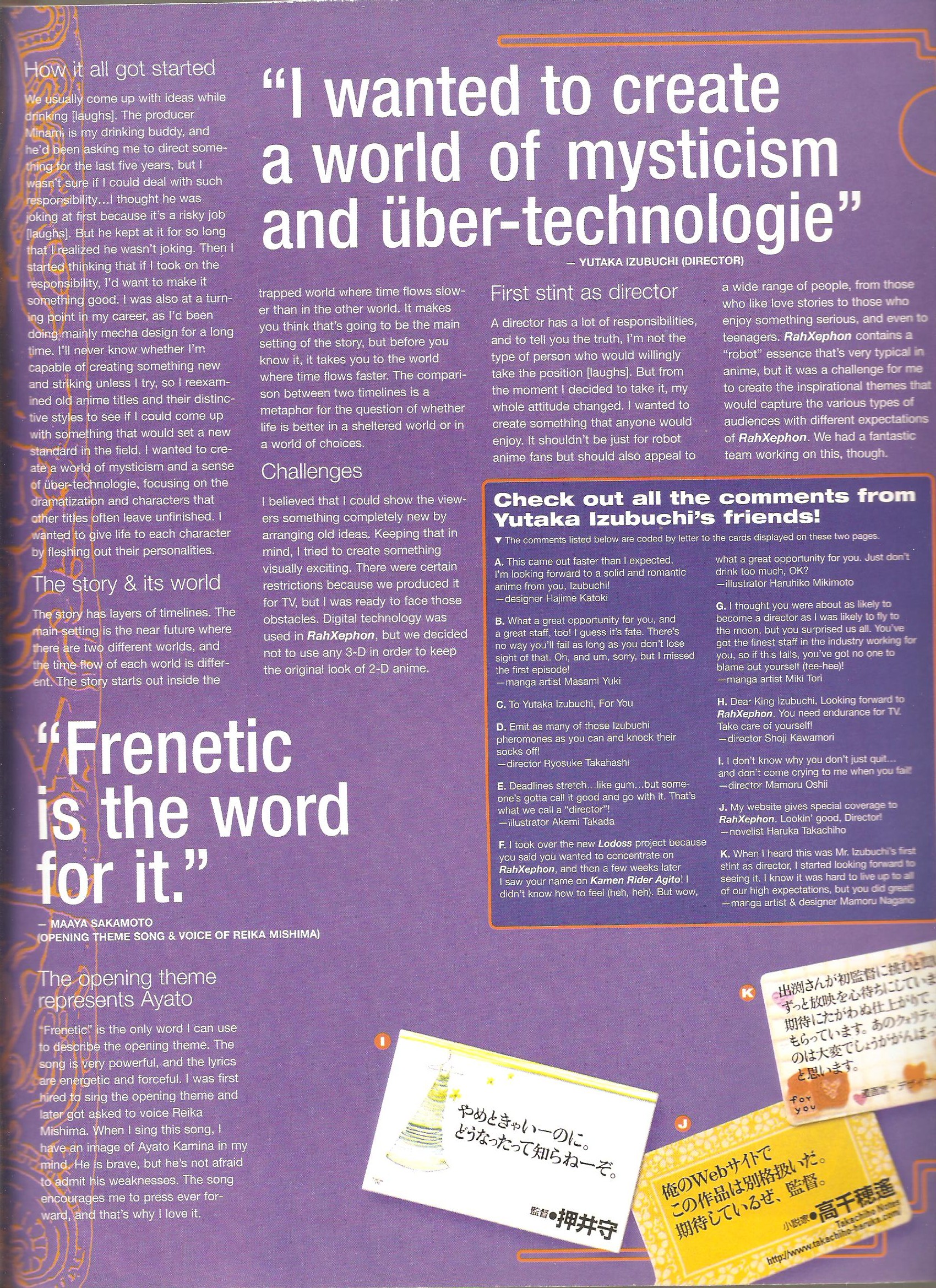 Yutaka Izubuchi jokes about the length of the Eva manga, goes over designing his preferred style of face-bearing robot, mentions his Sunrise Production Planning Division connection with the director of Gundam SEED, and talks about getting gently nudged into the director’s chair by Masahiko Minami (President of Bones). Also, he get a pretty hilarious congratulatory card from Mamoru Oshii; “I don’t know why you don’t just quit… and don’t come crying to me when you fail!” More refuse for my “Is Mamoru Oshii just affecting that cranky demeanor he always has in interviews, rather than being legitimately bitter?” pile.