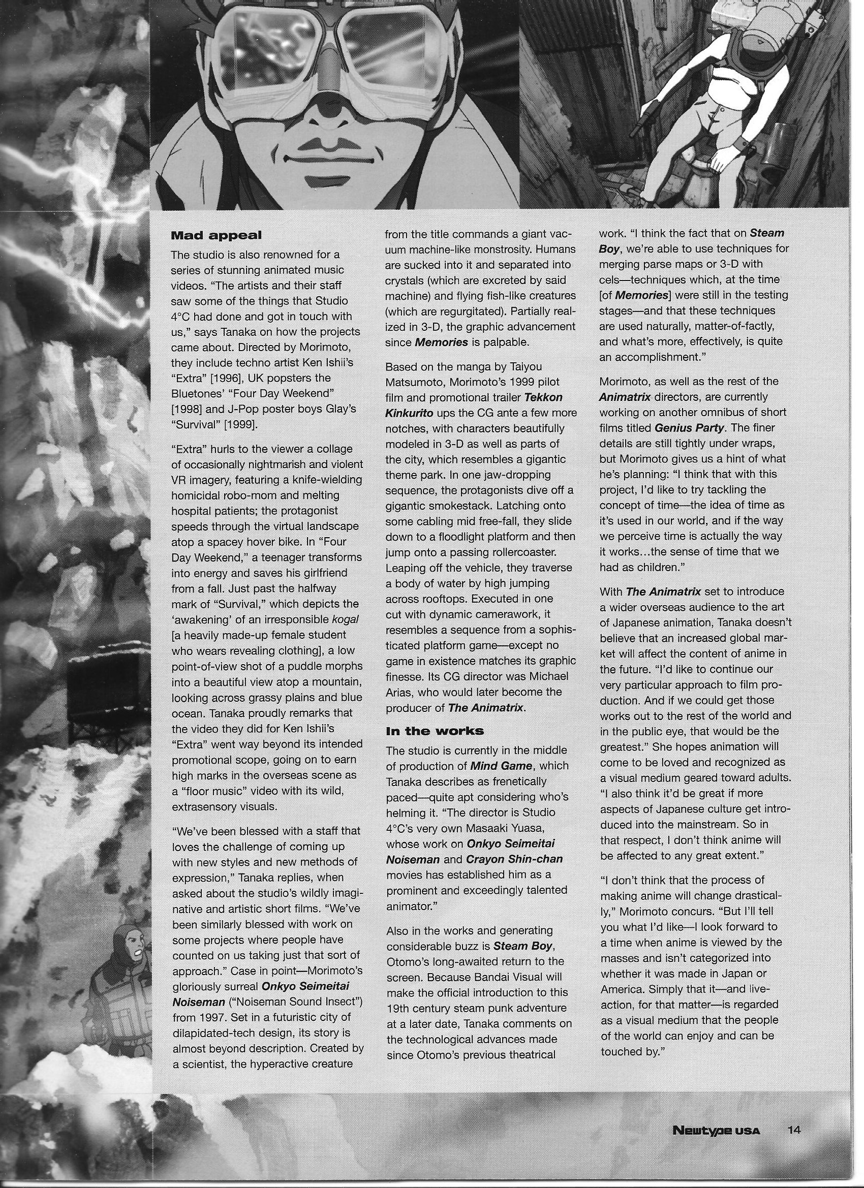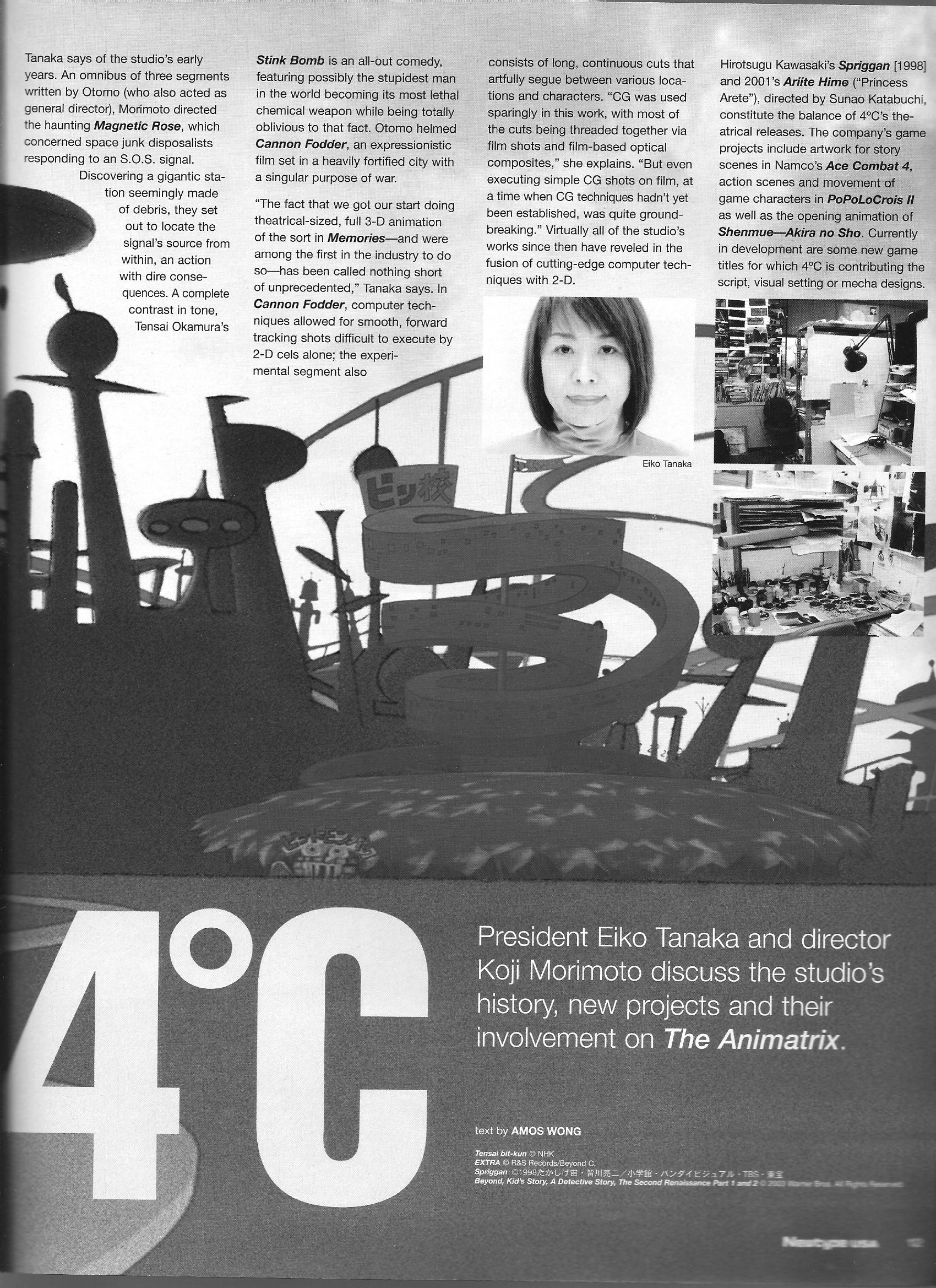 Along with an understanding of the broader context of the subject, the most vital ingredient to good anime coverage is a reliable source. So when US journalists actually interview people on the production side in Japan, it’s generally worth noting unless the interview consists entirely of fluff. This is the latest of what will hopefully be a couple more posts archiving articles from Newtype USA’s [inside] series of articles written by Amos Wong. This article on studio 4C includes President Eiko Tanaka talking about global markets and the technical aspect of continuous takes, Koji Morimoto talking about his work on the Animatrix and the producer who got him involved in the project, and Shinichiro Watanabe talking his issues with tight schedules.
