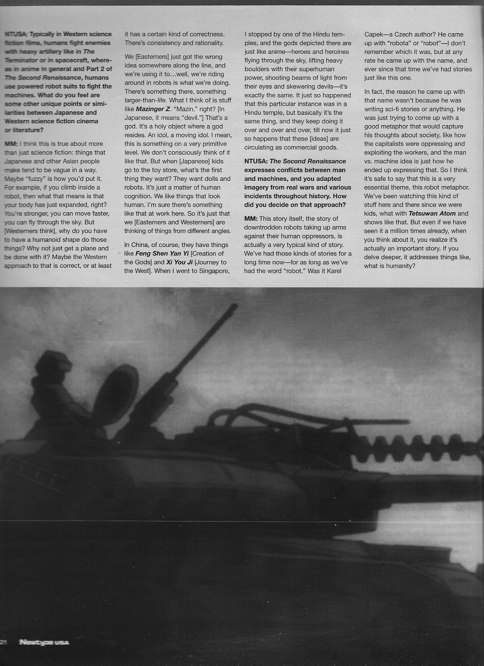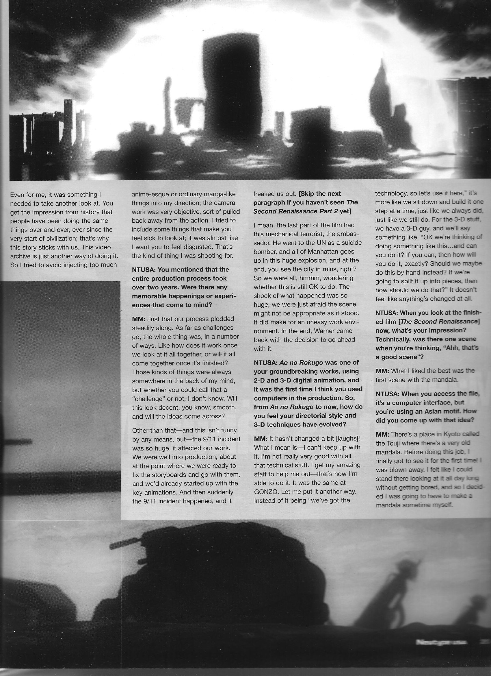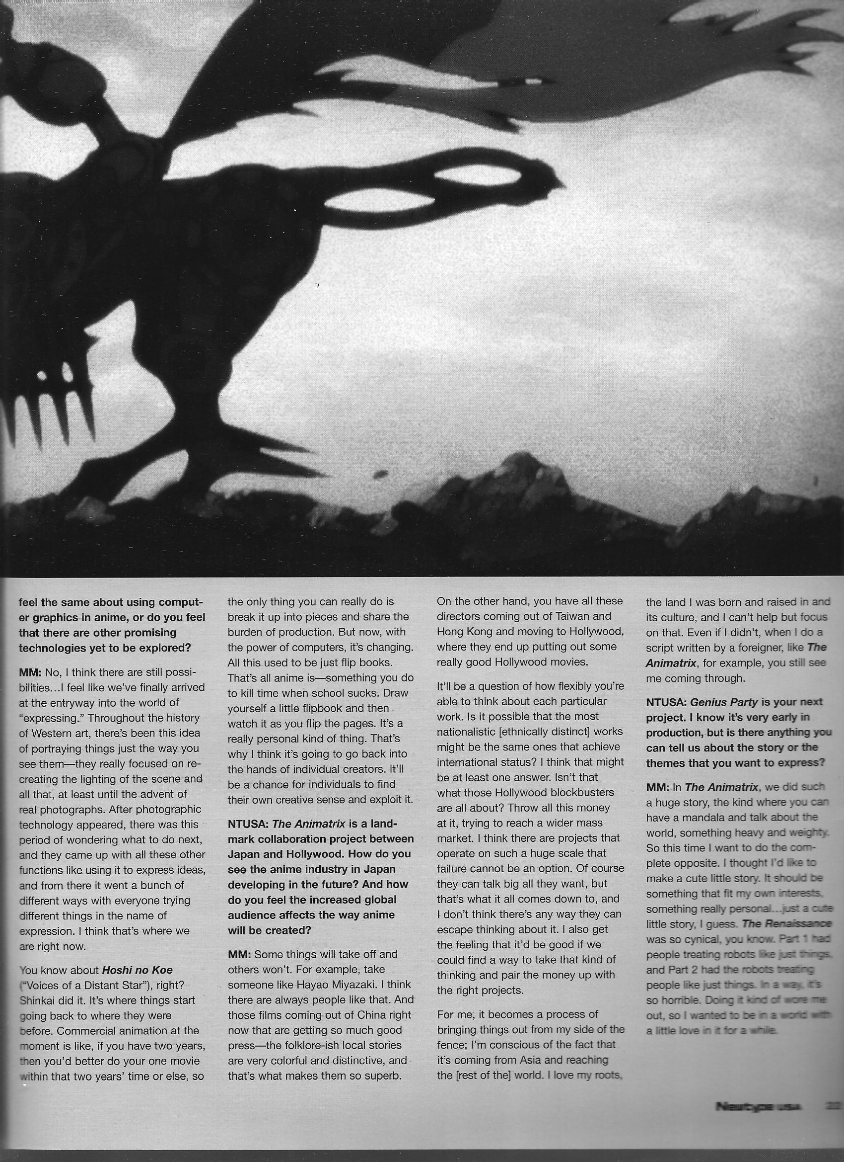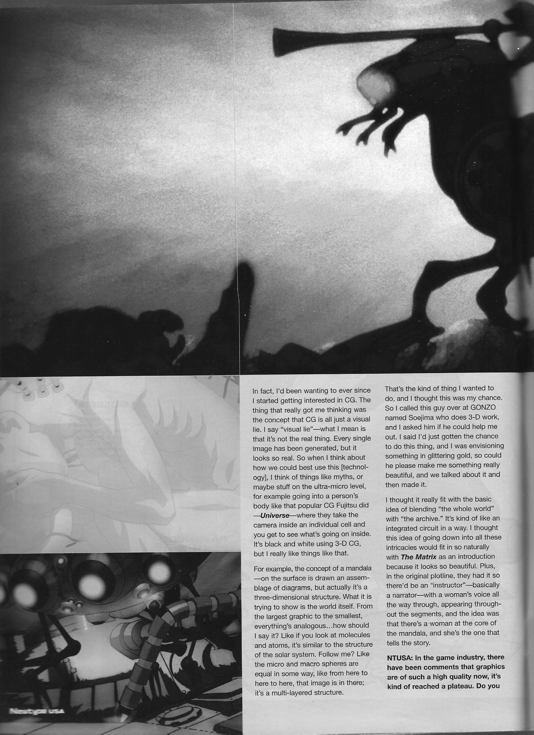 Maeda Mahiro discusses his work on The Second Renaissance portion of the Animatrix, which took a draw-first, write-later approach to creation. It also (weirdly) contains the other half of the director-CG guy conversation started by Hiroshi Shirai in the [inside] Gonzo article. Also has one of the better quotes I’ve read so far; “That’s all anime is – something you do to kill time when school sucks.” (Talking not about the viewers, but how animators get to drawing and how then-modern technology had made it easier to create things with that lackadaisical, bored-during-class feel.)