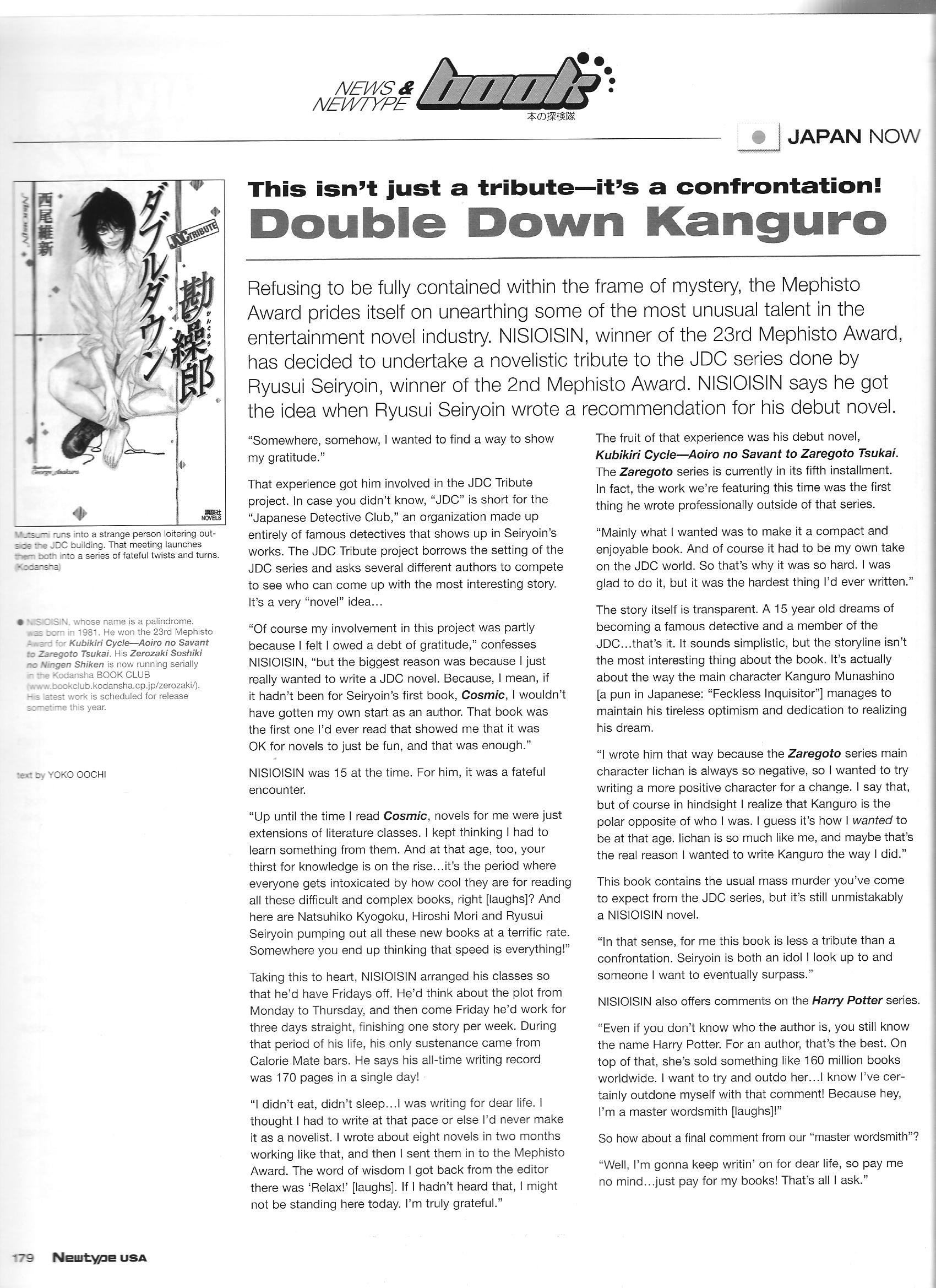 I’m going back through the issues I already scanned some articles from, and it turns out that just about every issue has an interview with a novelist, some of them now extremely prestigious. This issue includes one with NISIOISIN a good two years before the Monogatari series, where he mentions about his personal writing speed record – 170 pages in a day.