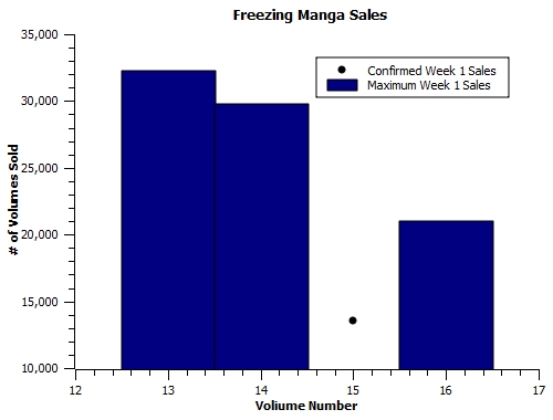 I’m going to consider first-time charting significant if a previous volume was released under a threshold that would not have prevented the first-time-on-charts total from charting. In other words, most series charting for the first time will make this cut, but it’ll disqualify series like Freezing that charted under these ridiculously friendly circumstances: