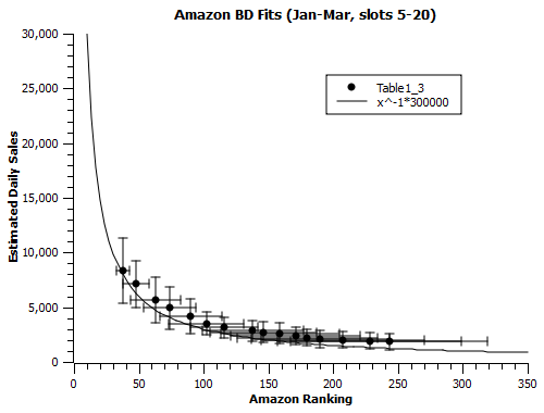 My basis for the following guesswork is as follows: I now have several additional months of data on US BD top 20 charts compared to when I first outlined a super-rough method of guessing at US sales totals using amazon ranks (the charts I have now cover most of January through March). I can also fairly say that the figures for the month of December were huge outliers; the lowest threshold in that month was 35,000 or higher, compared with a high of about 25,000 after. So after using this new data and scrapping the overly high estimates for the old data, I’m left with a very different-looking set of points to fit. While I haven’t done detailed work in fitting these points, I have found a by-eye fit that works passably well: