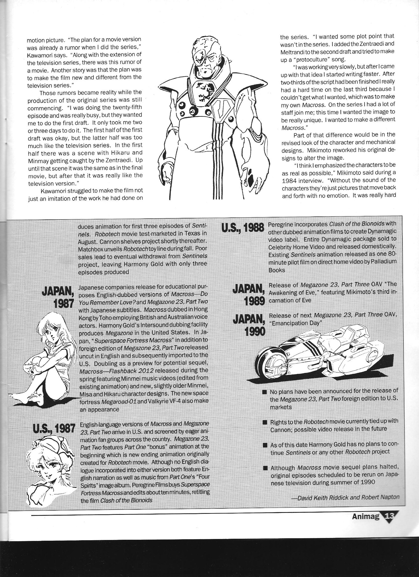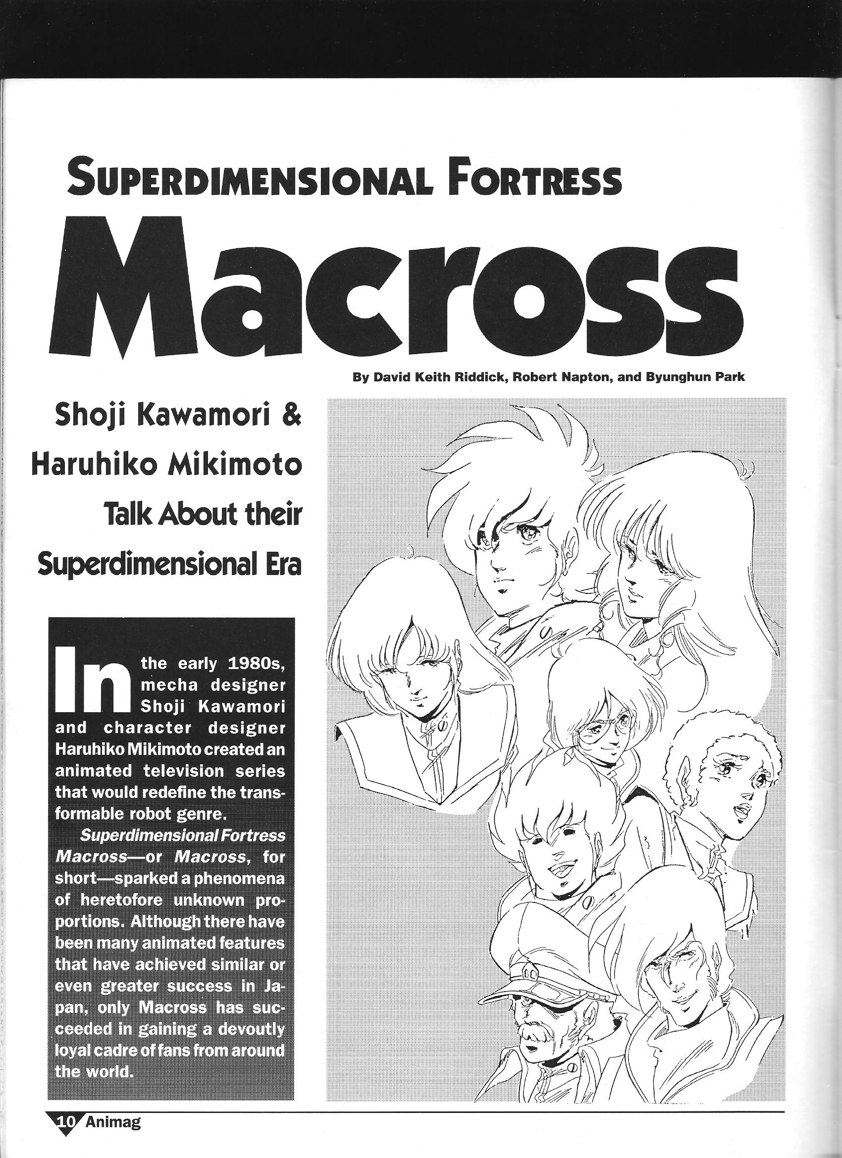 This Animag article, in addition to providing a contemporary view of the Macross franchise, features a couple of neat anecdotes about Shoji Kawamori having to choose between Macross and college, redrafting the script of DYRL, and reacting to the voice acting in Robotech.