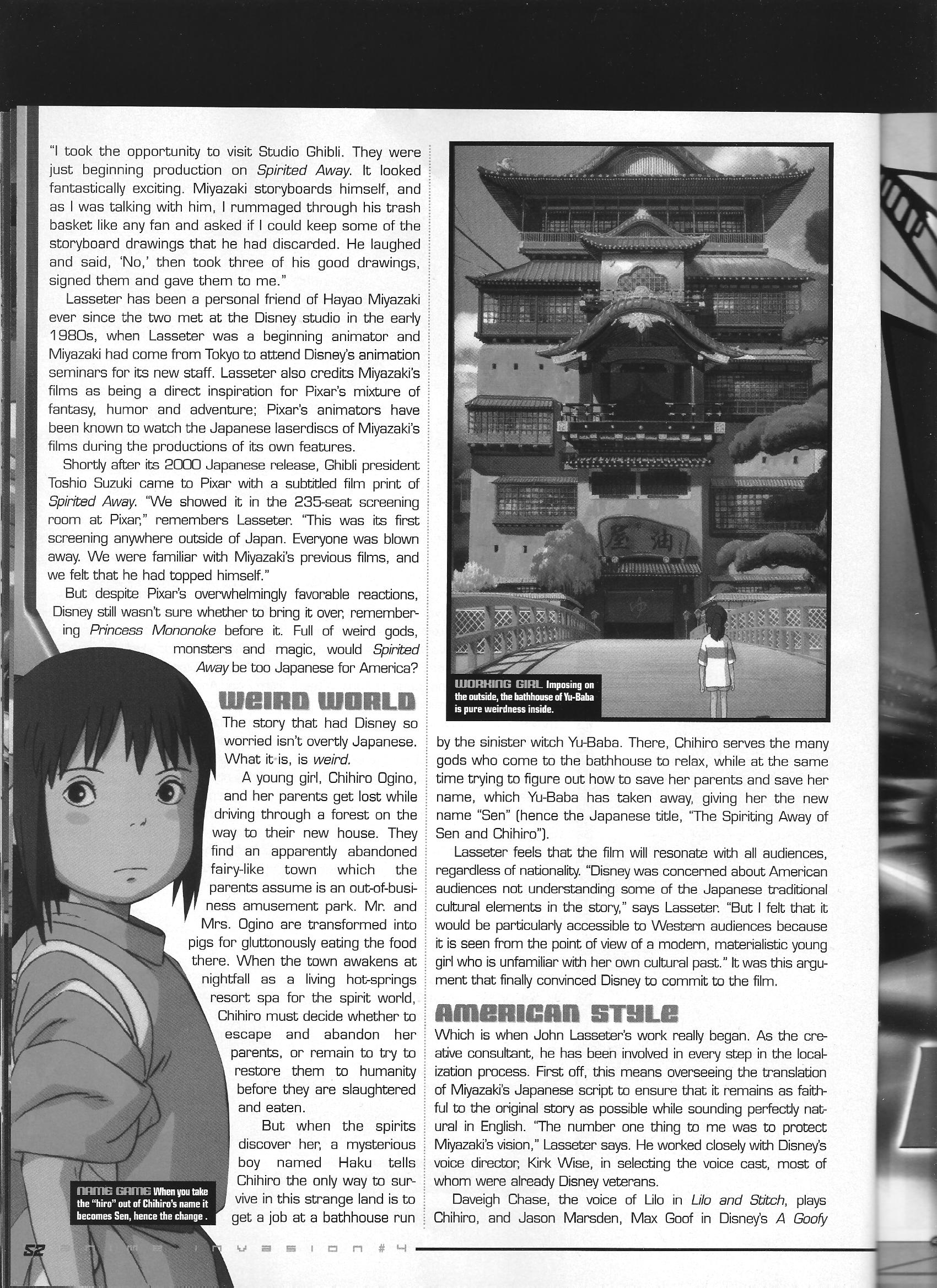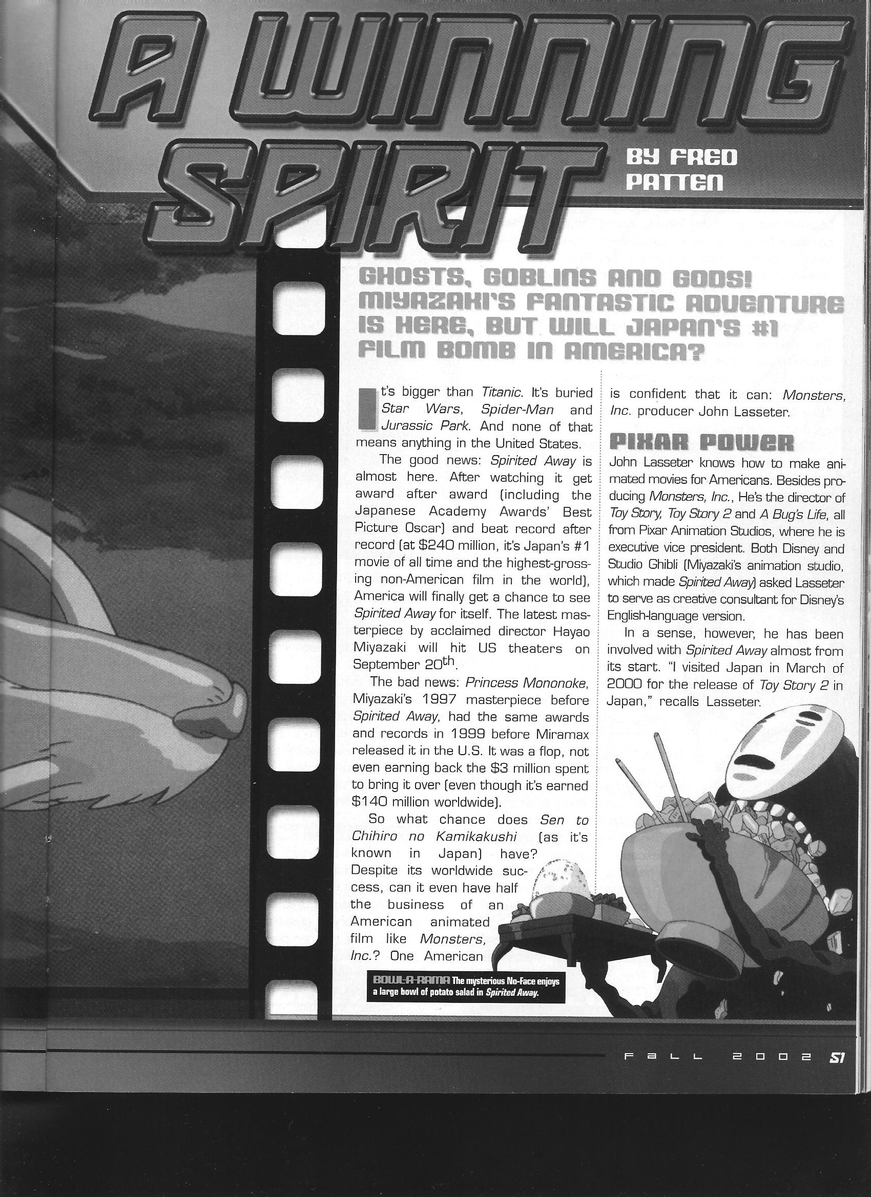 Via Anime Insider: John Lasseter on Spirited Away (Fall 2002) Posted on June 22, 2014 by torisunanohokori This feature article on Spirited Away includes a bit with Pixar bigwig John Lasseter talking about his role in localizing Spirited Away. Share this: Click to share on X (Opens in new window) X Click to share on Facebook (Opens in new window) Facebook Like Loading...