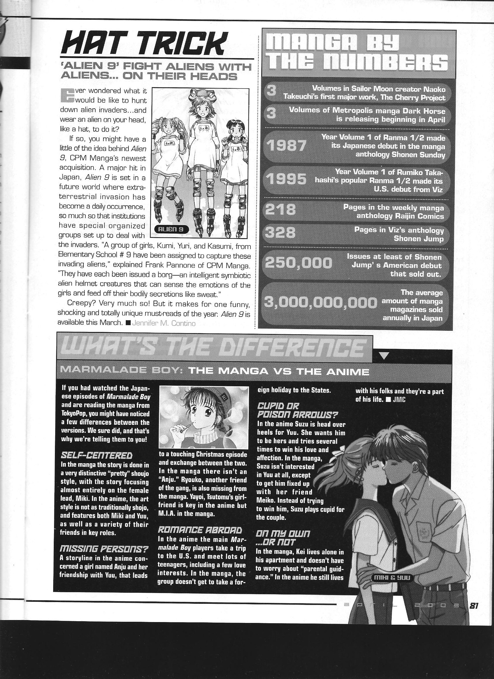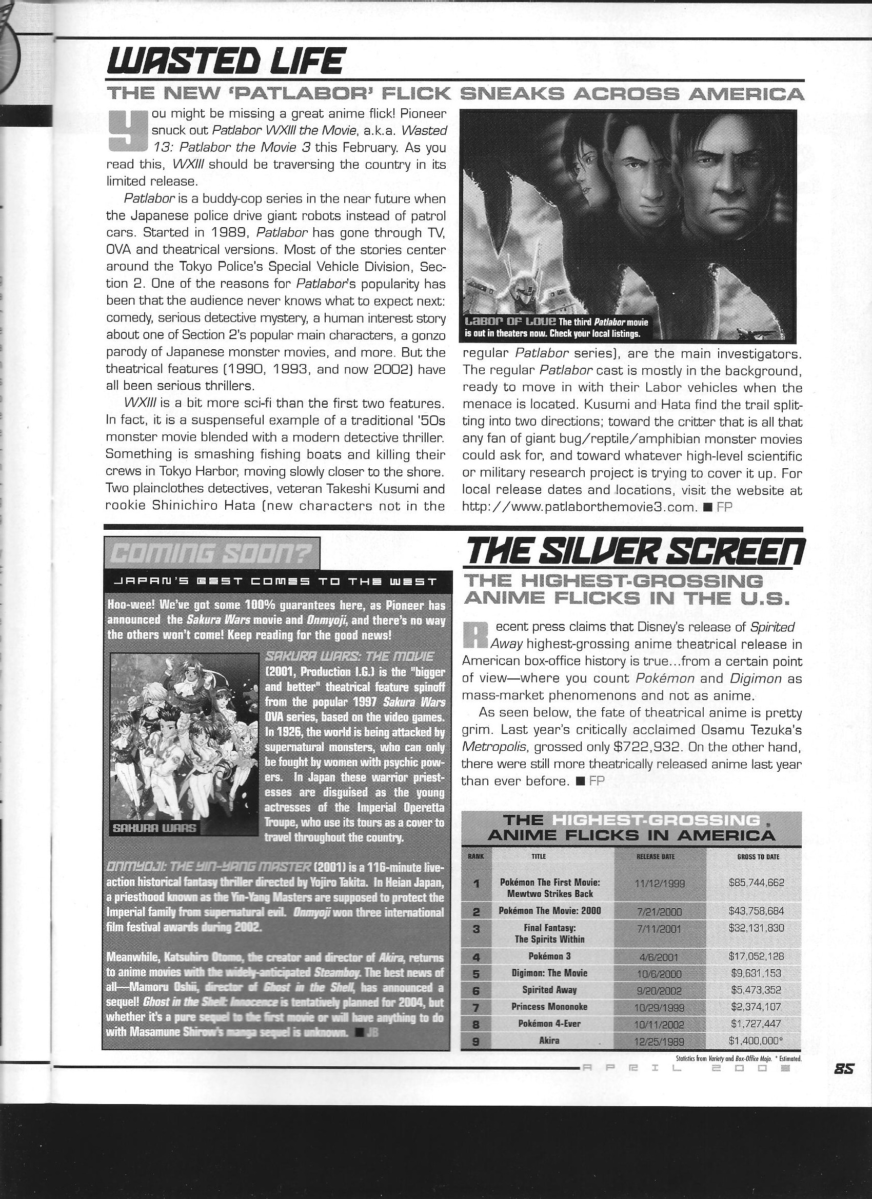 Two separate bits of info that come in small blurbs – one gives the sales total for the first issue of US Shonen Jump as about 250,000 copies (a factor of 10 less than its Japanese parent), and the other gives the contemporary box office records of the best-performing anime movies released in the US.