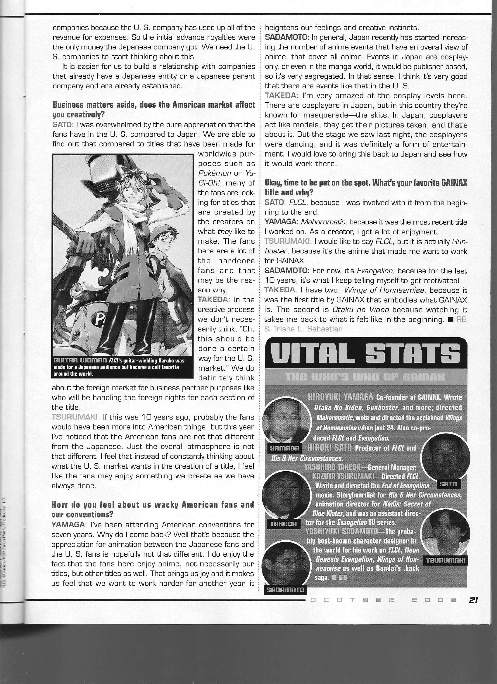 An interview with Gainax staff, namely Hiroki Yamaga, Yasuhiro Takeda, Kazuya Tsurumaki, Hiroki Sato, and Yoshiyuki Sadamoto, that touches on working with US companies, the differences between American/Japanese conventions, and their personal favorite titles.