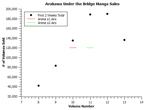 Note: For High School of the Dead, both volumes 4 and 5 came out well before the anime, and volume 6 came out during its broadcast. The gap in time was so big that they came out before mal tracked numbers for series, only posting top 10 lists. I used the available 2008 manga data to approximate the average value, in volumes, of the #10 slot to get a rough estimate of the threshold. Even holding v4 and v5 to the maximum threshold from those weeks, the 130,000 v6 and 200,000 v7 it puts up post-anime is evidence of a significant bump.