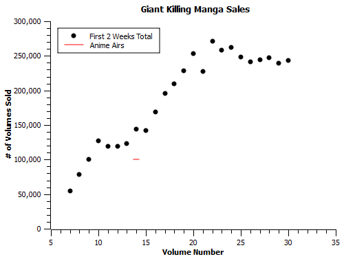 -Giant Killing plateaued prior to the anime, which makes the prolonged, steady rise in its wake particularly impressive.
