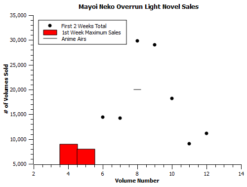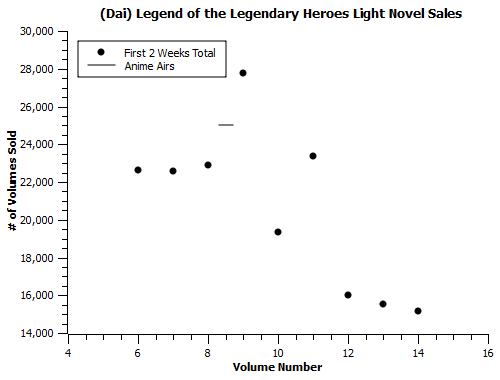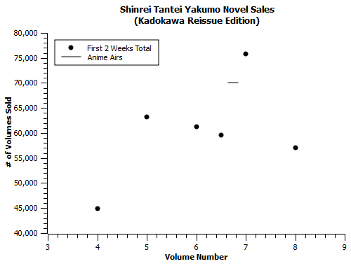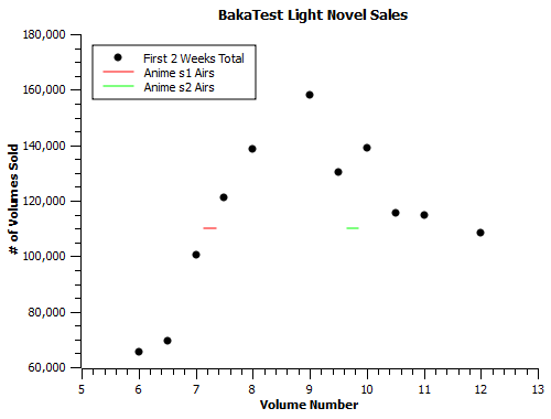 In any event, the pre/post-anime two-week sales totals of the light novels for which they’re available are recorded here and plotted below.