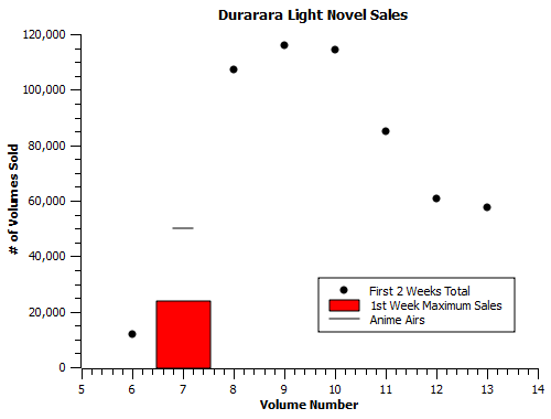 –This week, or really a two-week period, had insanely high thresholds in the mid-20,000s that confused the crap out of me at first. Would have been nice to have that datapoint for Durarara/Ookami-san.