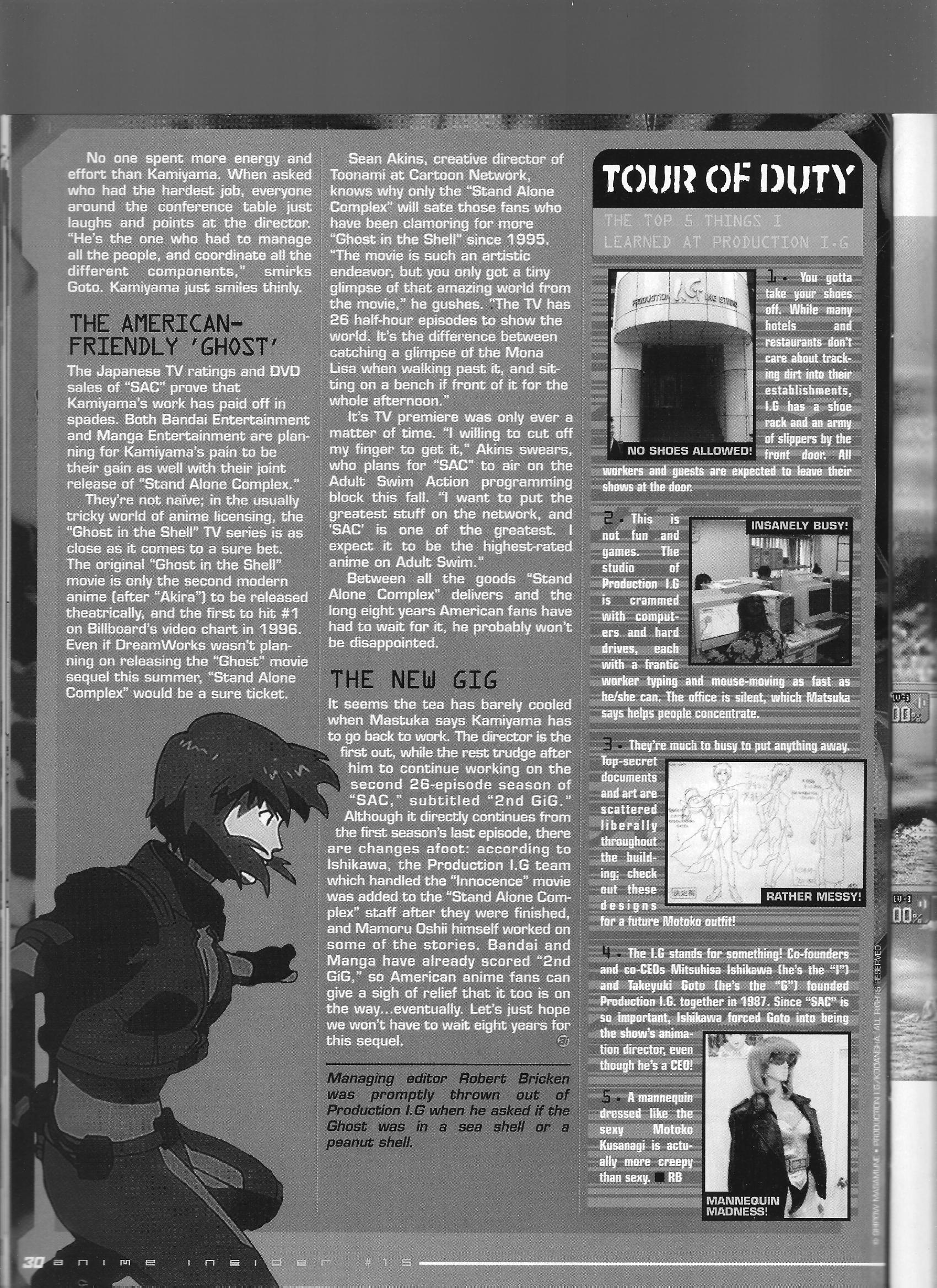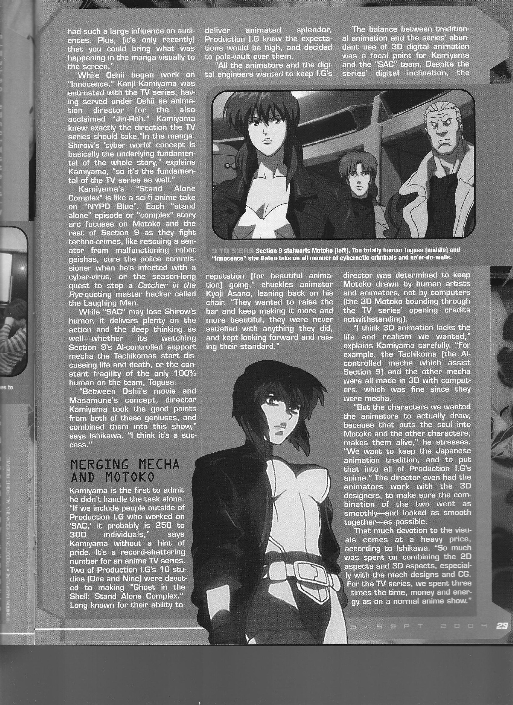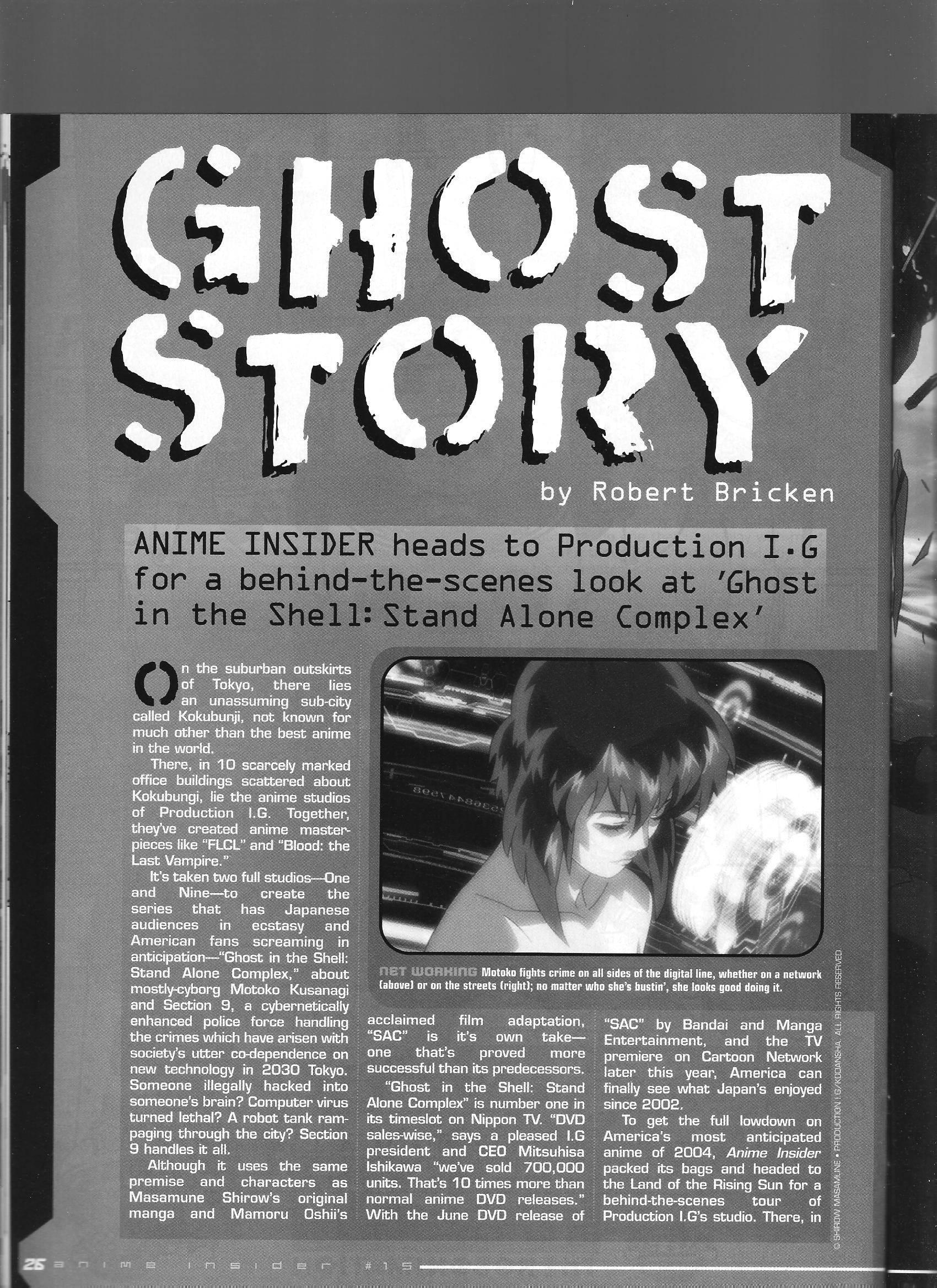 Production IG CEO Mitsuhisa Ishikawa and Director Kenji Kamiyama talk about Ghost in the Shell: Stand Alone Complex. Kamiyama talks about his take on the gits universe, and Ishikawa boasts about a sales total of 700,000 units, a total that blows away the DVD/BD wiki totals.