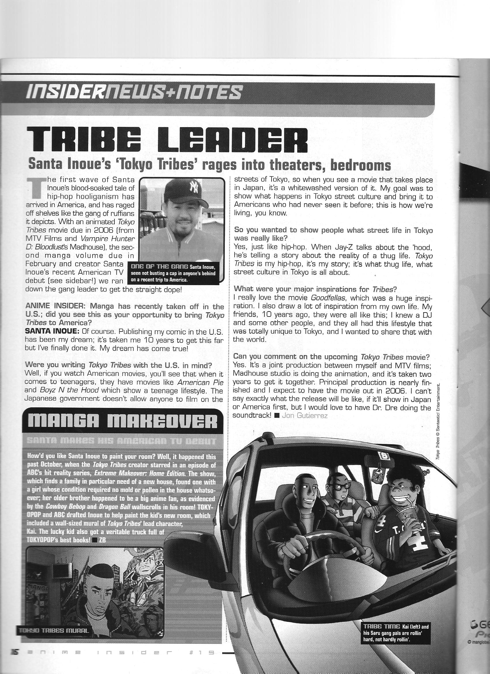 Via Anime Insider: Santa Inoue (February 2005) Posted on June 29, 2014 by torisunanohokori Tokyo Tribes author Santa Inoue talks about his mission to portray authentic Tokyo street culture in his manga. Share this: Click to share on X (Opens in new window) X Click to share on Facebook (Opens in new window) Facebook Like Loading...