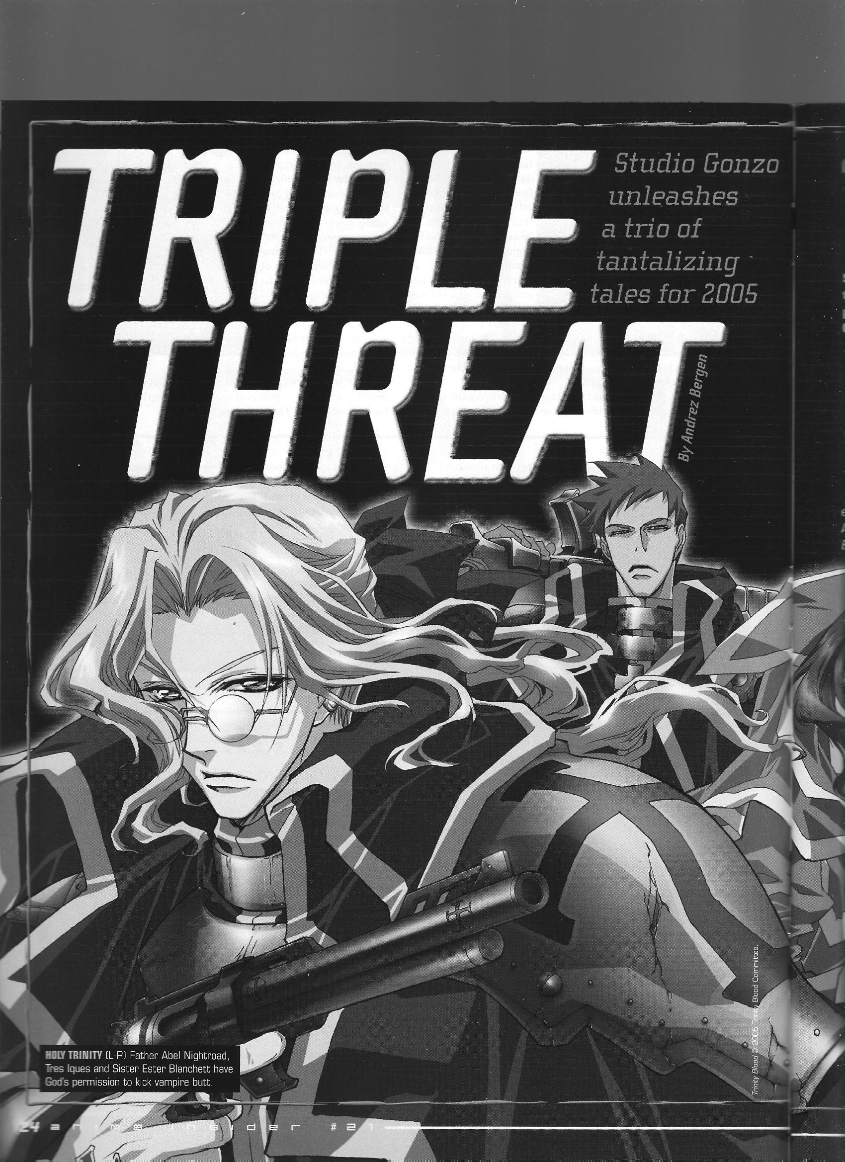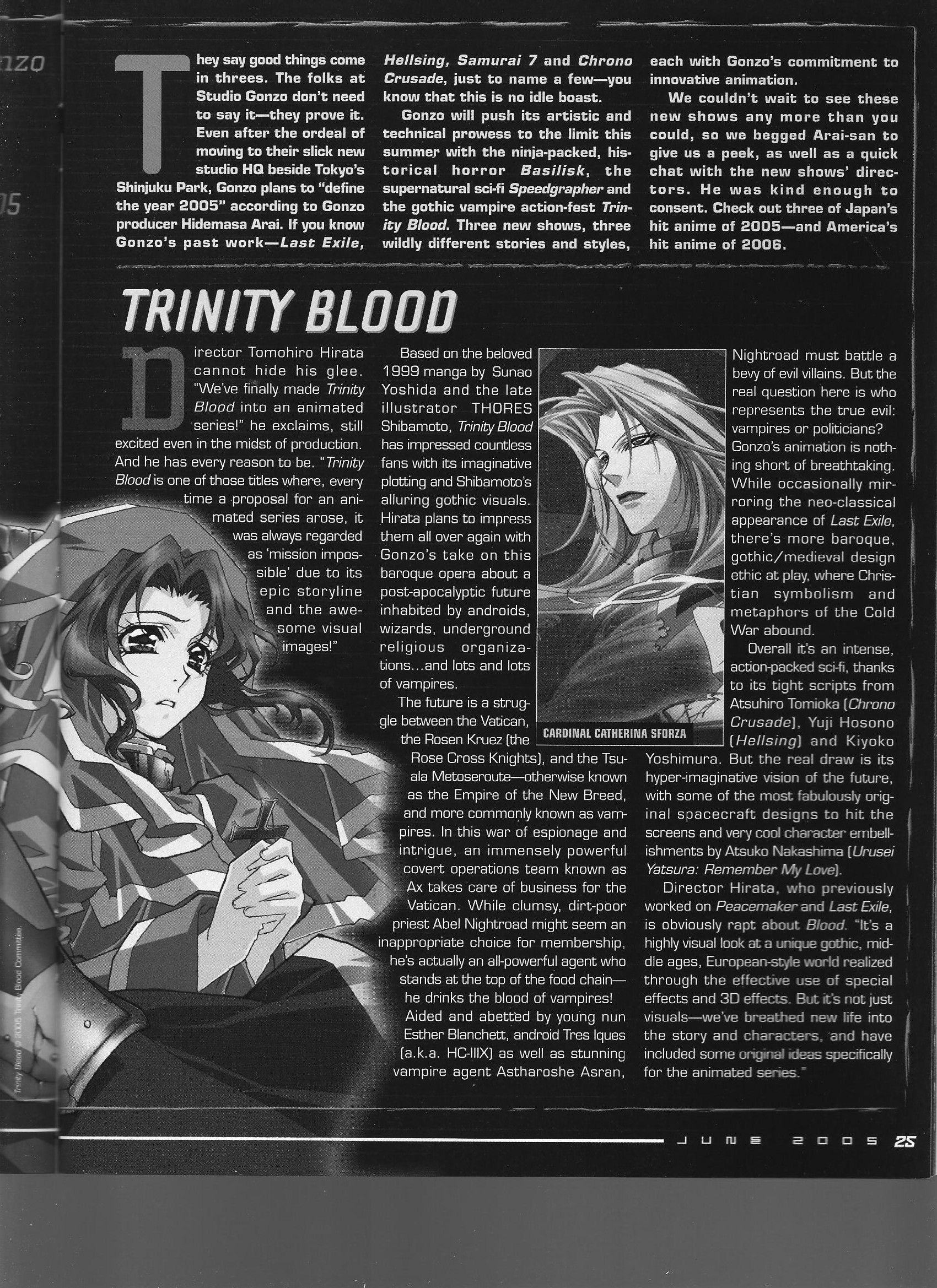 Via Anime Insider: Various Gonzo Shows (June 2005) Posted on July 6, 2014 by torisunanohokori Contains one Gonzo-related poor business practices tidbit: Trinity Blood was rejected multiple times as a ‘mission impossible’ type of project, per director Tomohiro Hirata. Share this: Click to share on X (Opens in new window) X Click to share on Facebook (Opens in new window) Facebook Like Loading...