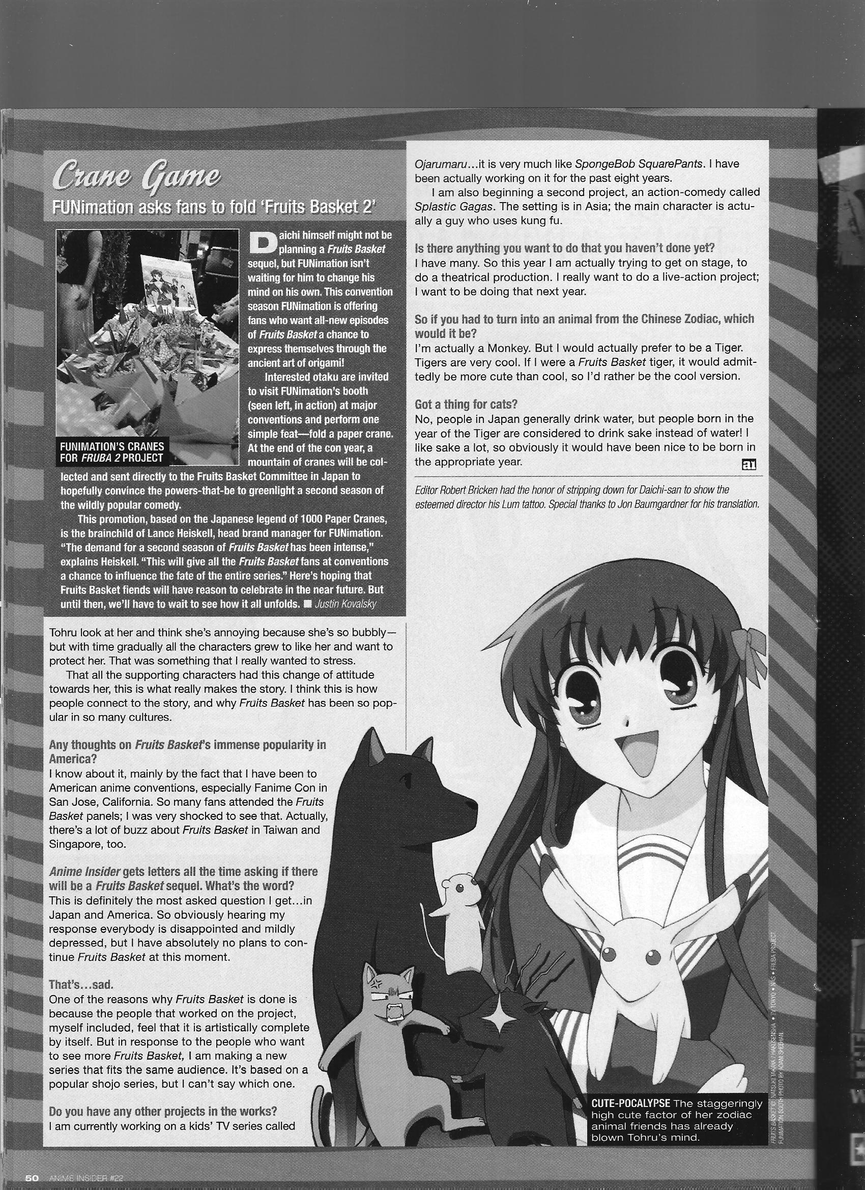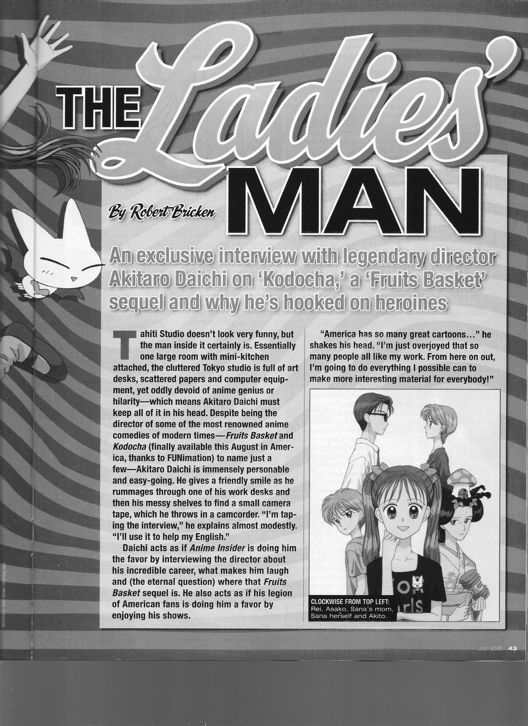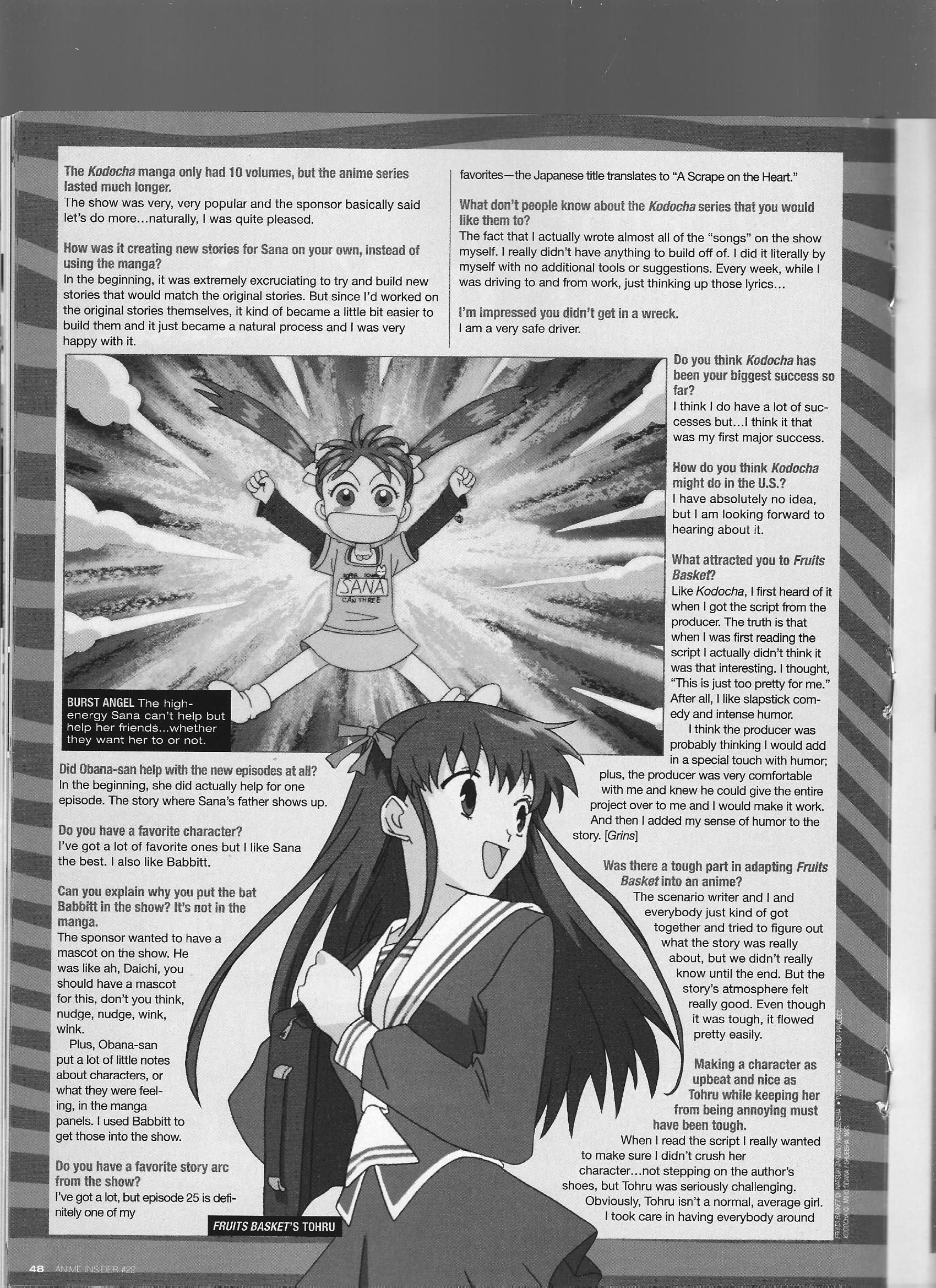 The cool Akitaro Daichi talks about all sorts of stuff, including sponsors’ influence on Kodocha, writing Sana’s improv songs from Kodocha basically solo, details on the production of Fruits Basket (he says he got the script because the producer was comfortable with him and that he didn’t get what the story was about until near the end of the show), and Kodocha author Miho Obana dancing the flamenco in Times Square.