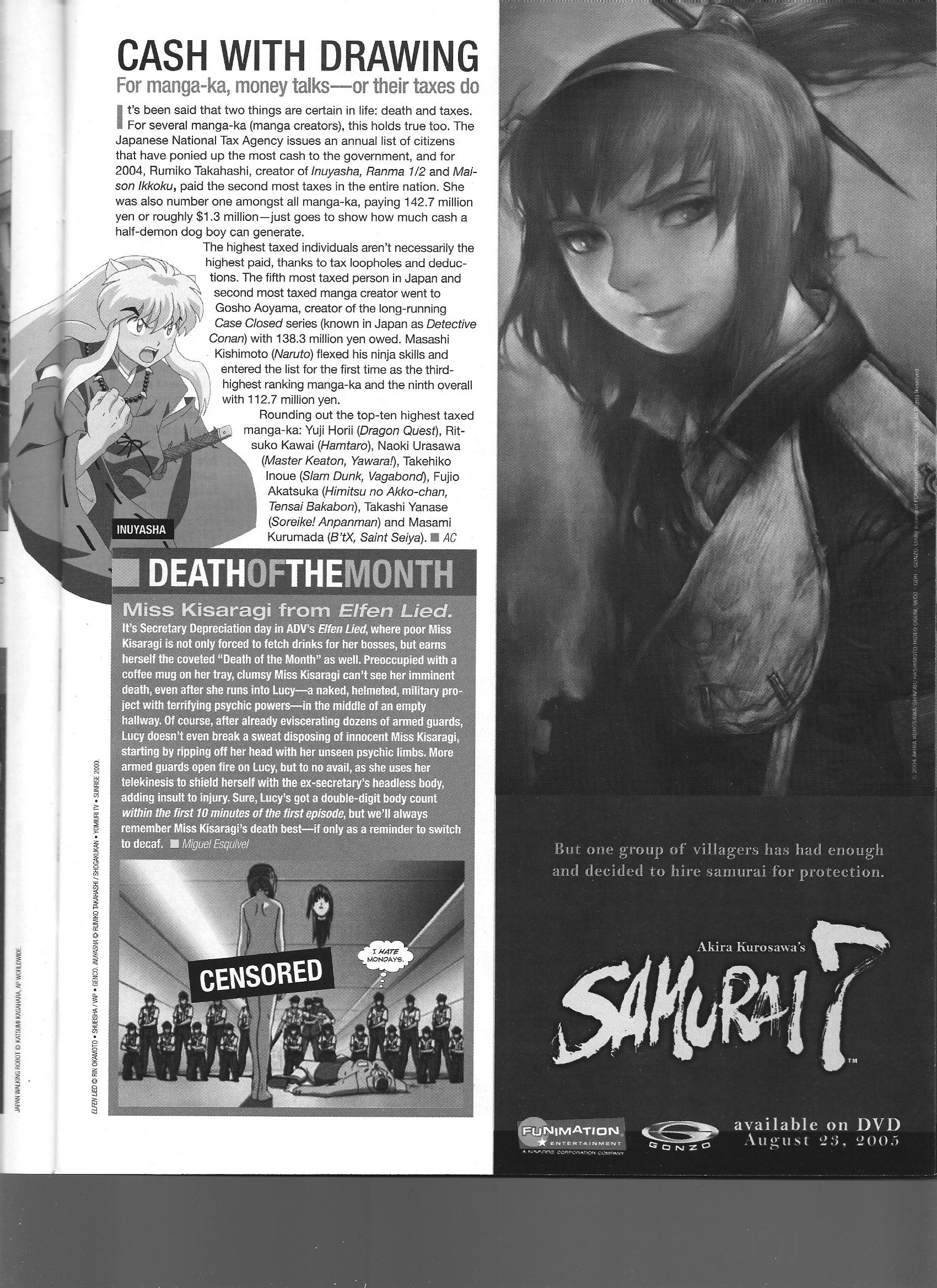 A short article on the most-taxed mangaka (a list topped in 2005 by Rumiko Takahashi). There are probably more recent lists that would be likewise interesting to see and almost certainly include Oda Eiichiro, though I couldn’t find them with a casual google.