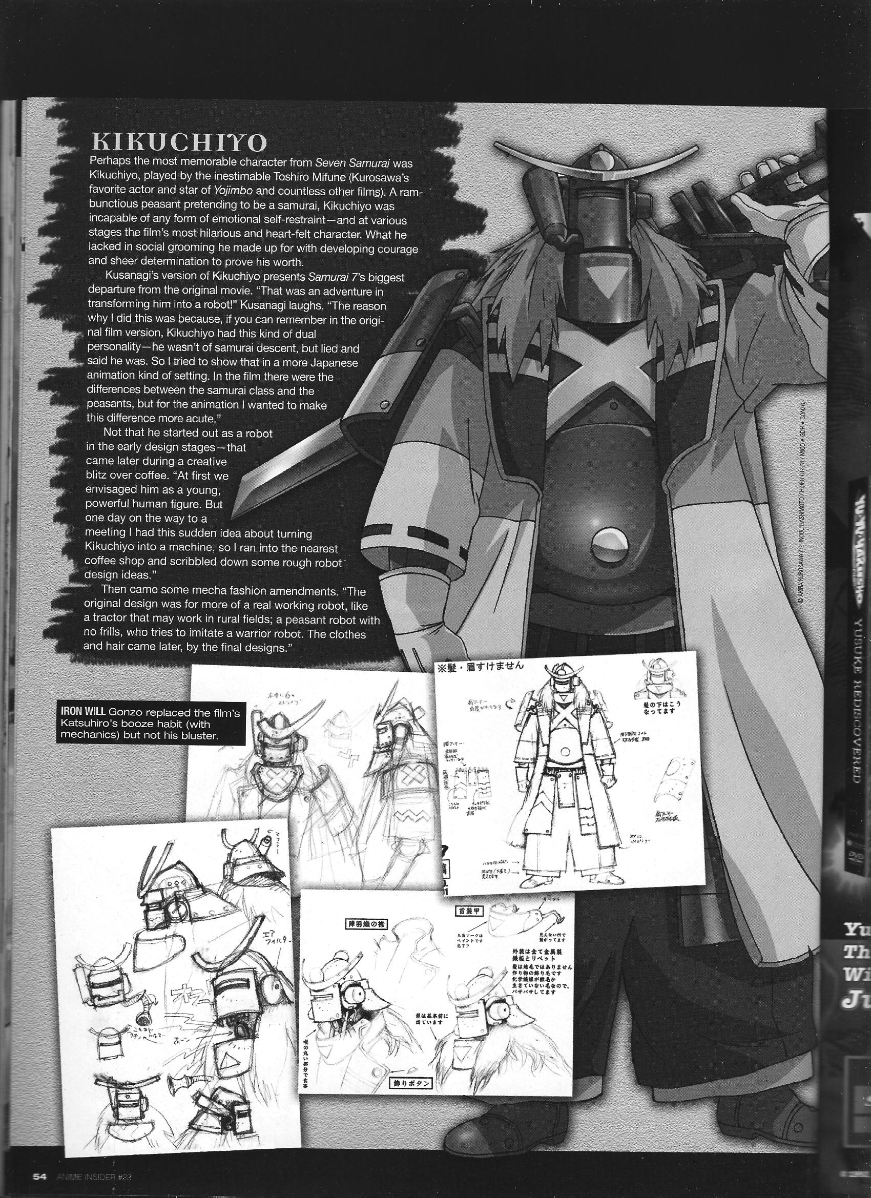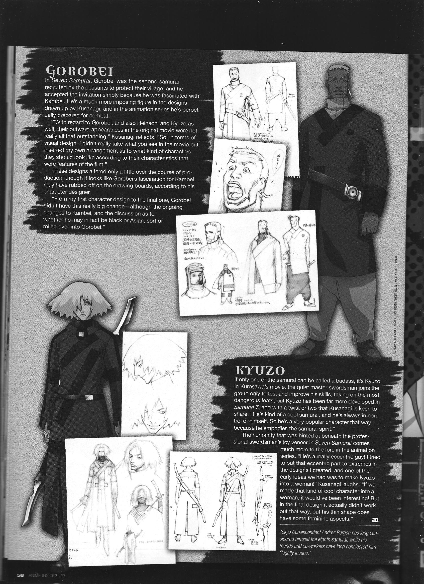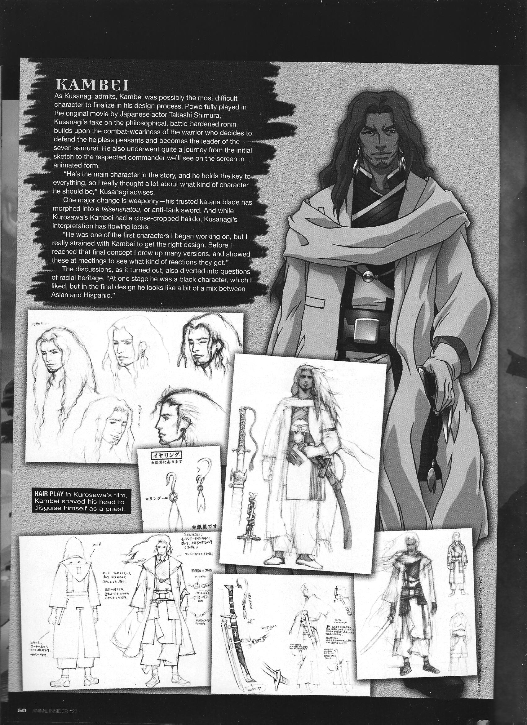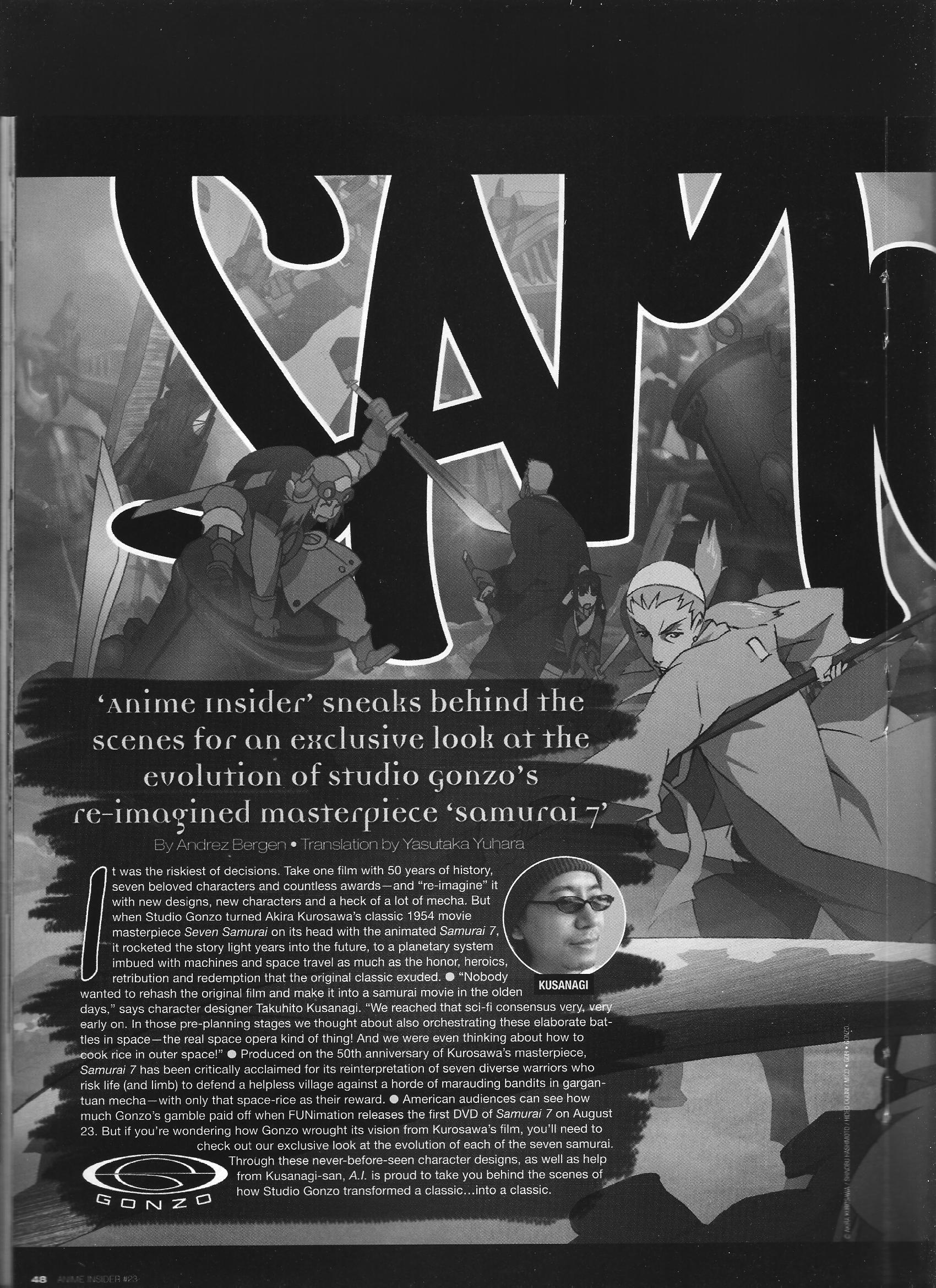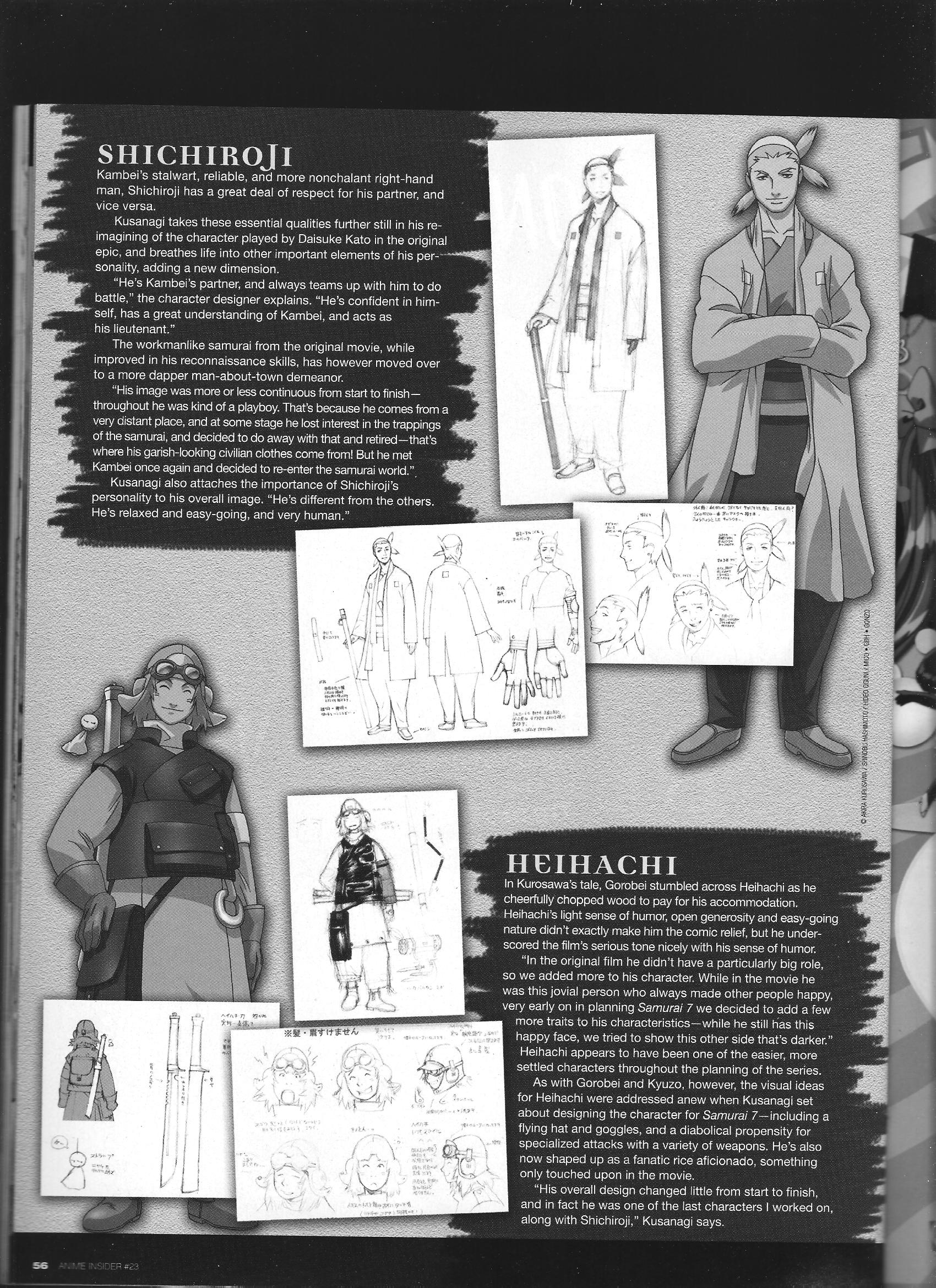 Via Anime Insider: Takuhito Kusanagi (August 2005) Posted on July 8, 2014 by torisunanohokori Samurai 7 character designer Takuhito Kusanagi walks through his thoughts on designing the series’ main cast. Share this: Click to share on X (Opens in new window) X Click to share on Facebook (Opens in new window) Facebook Like Loading...