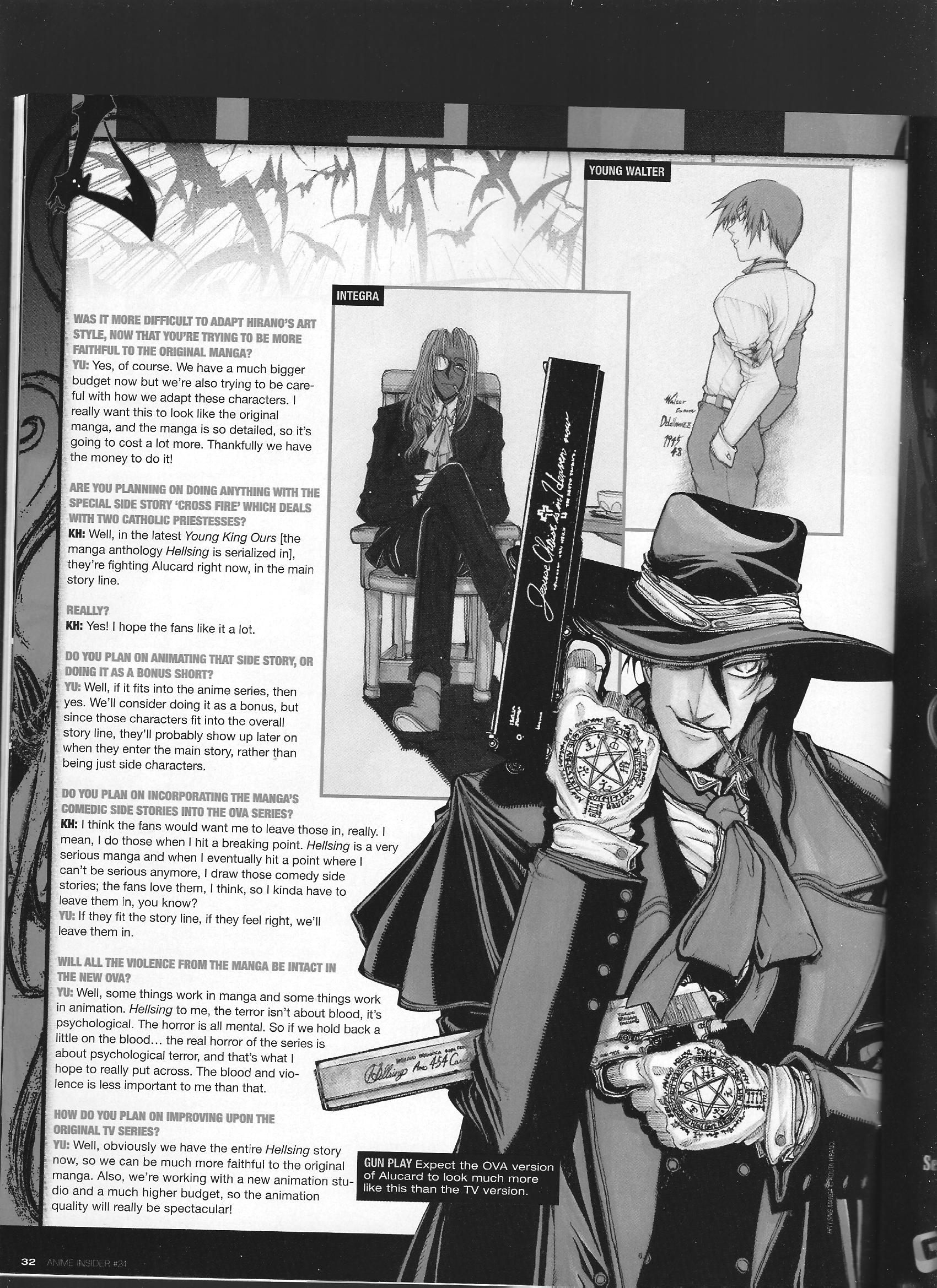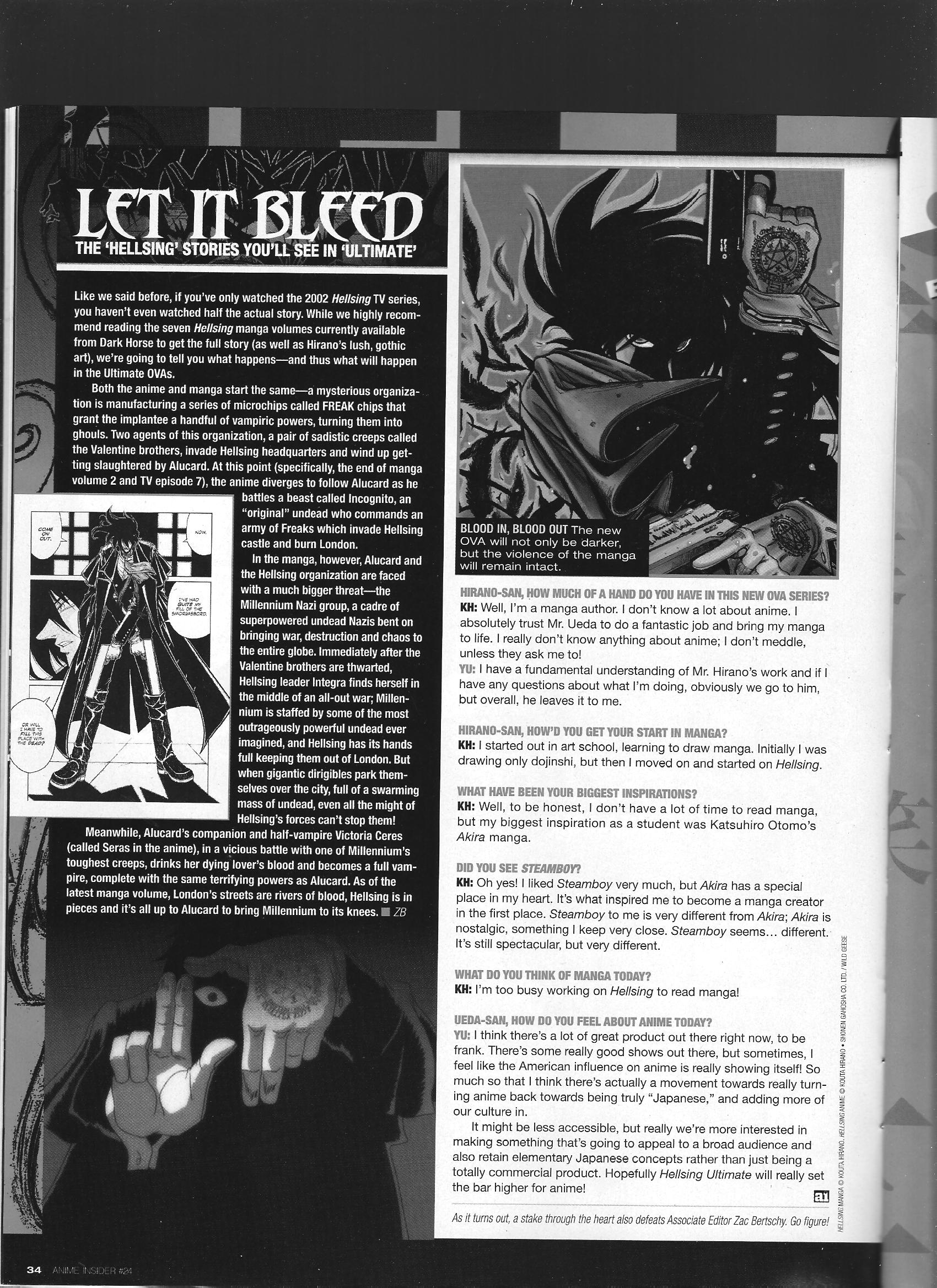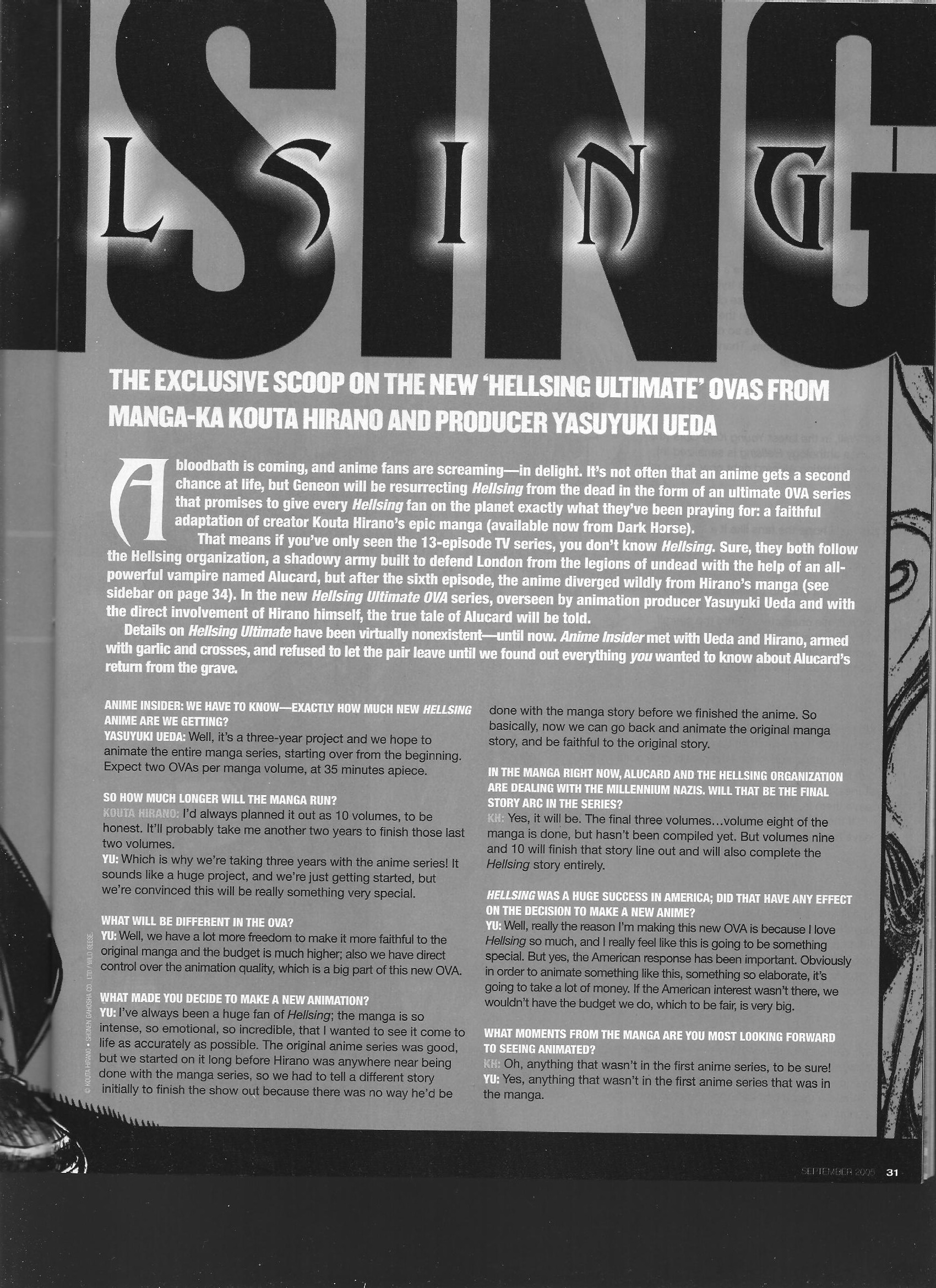 Via Anime Insider: Kouta Hirano and Yasuyuki Ueda (September 2005) Posted on July 10, 2014 by torisunanohokori Author Kouta Hirano and Yasuyuki Ueda talk about rebooting the Hellsing franchise with different goals and Hirano’s inspiration as an author, and various other things. Share this: Click to share on X (Opens in new window) X Click to share on Facebook (Opens in new window) Facebook Like Loading...