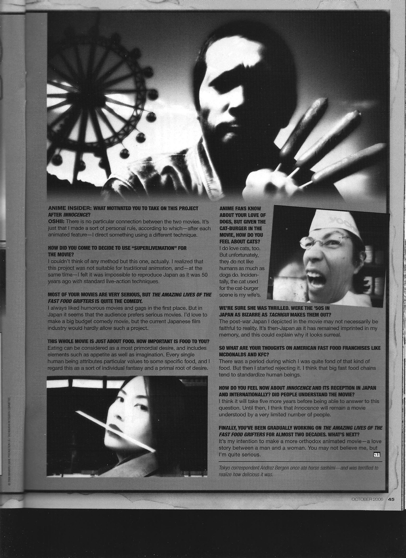 Via Anime Insider: Mamoru Oshii on Tachigui (October 2006) Posted on July 12, 2014 by torisunanohokori Mamoru Oshii talks about Tachigui/Eat and Run, one of his live-action movies, and fast food. Share this: Click to share on X (Opens in new window) X Click to share on Facebook (Opens in new window) Facebook Like Loading...
