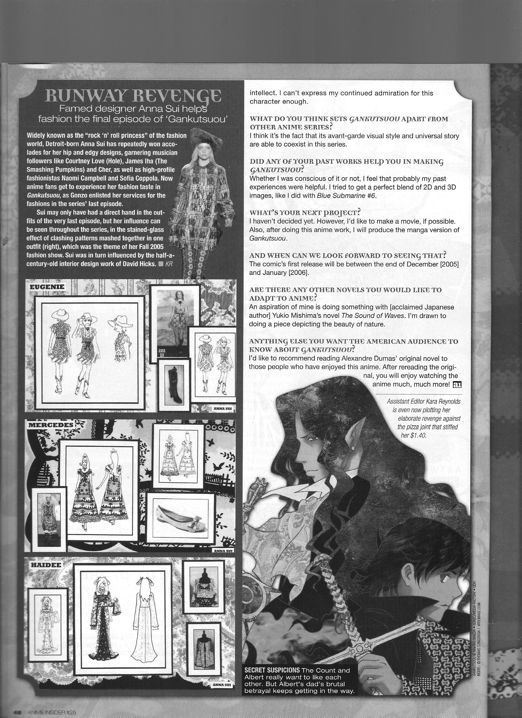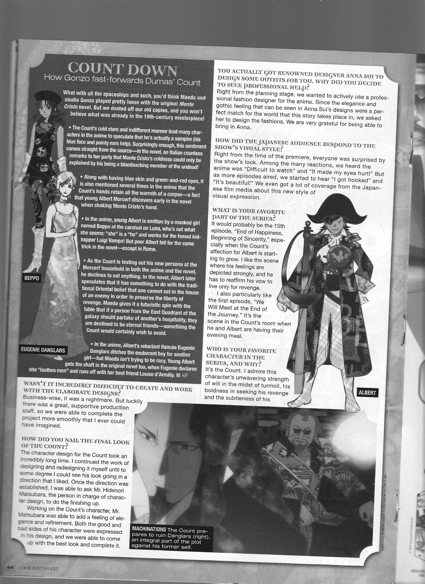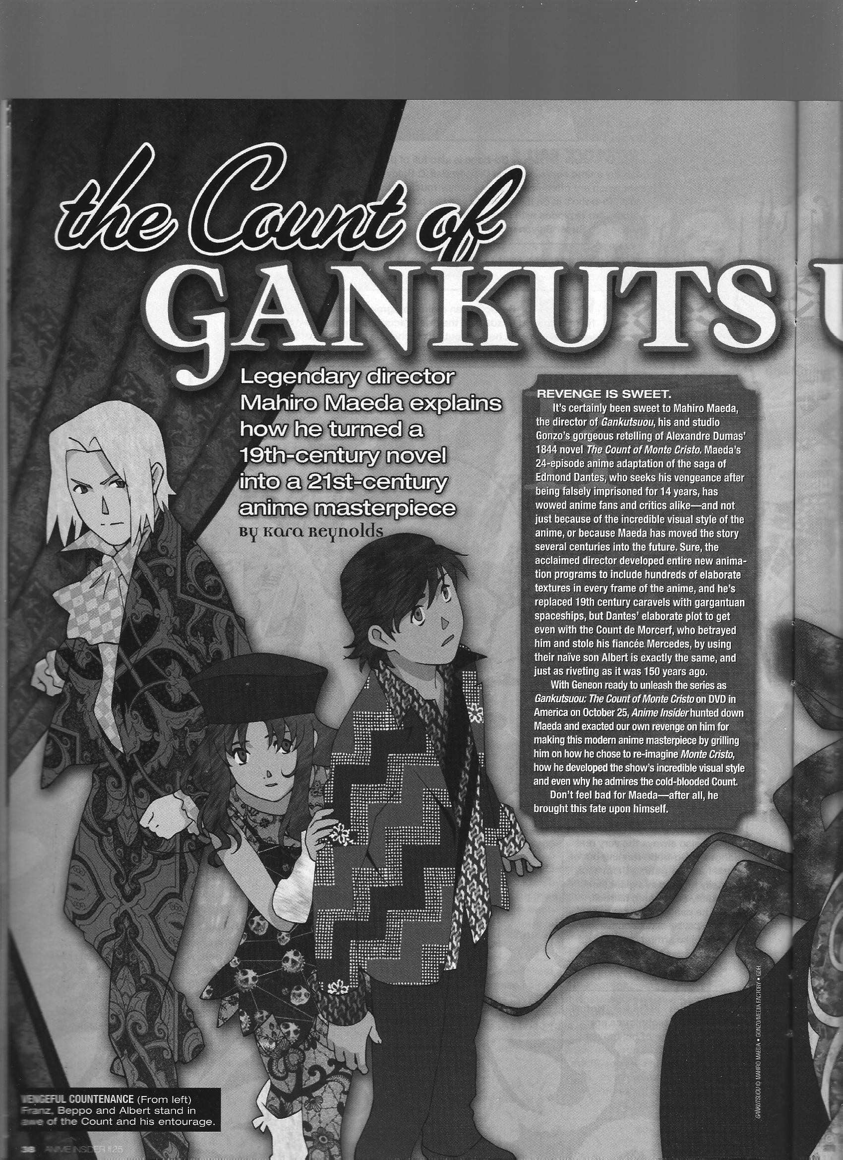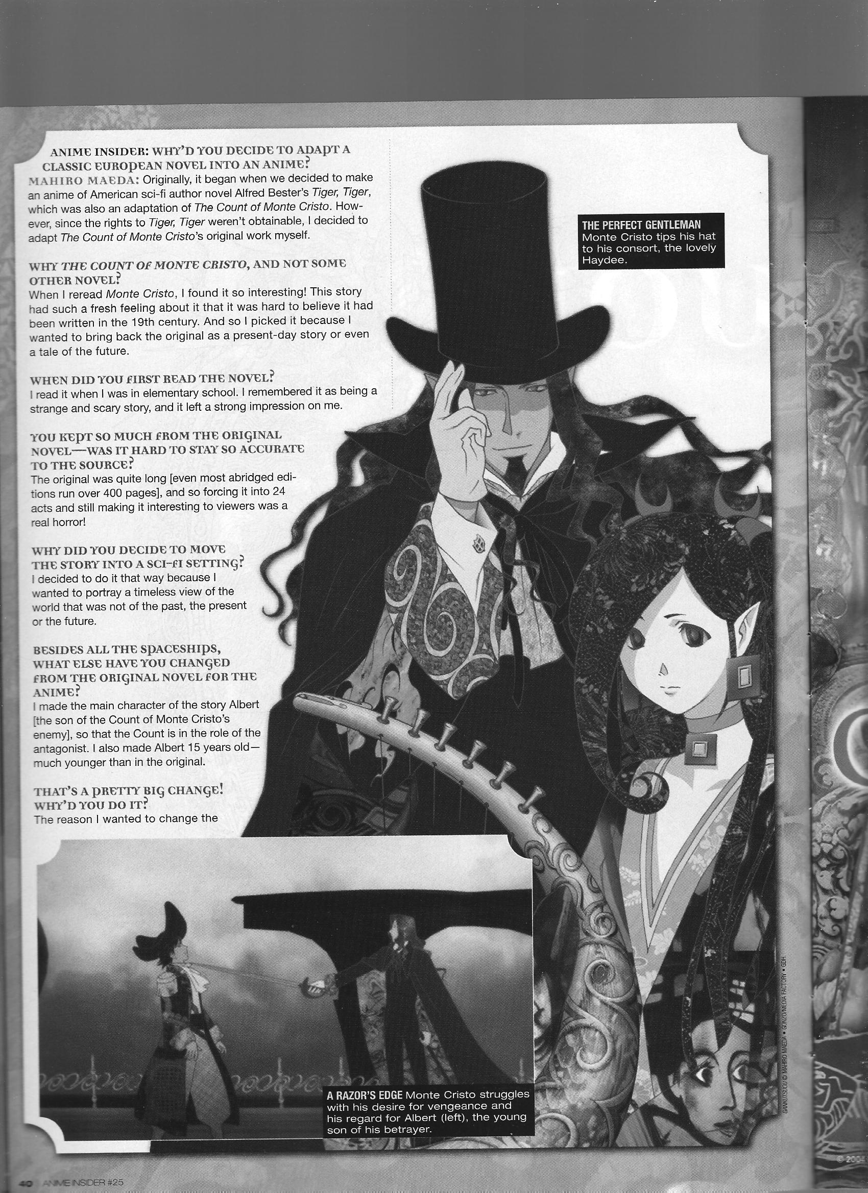 Via Anime Insider: Mahiro Maeda (October 2005) Posted on July 13, 2014 by torisunanohokori Gankutsuou director Mahiro Maeda talks about the details of the adaptation and his favorite parts of the series. Share this: Click to share on X (Opens in new window) X Click to share on Facebook (Opens in new window) Facebook Like Loading...