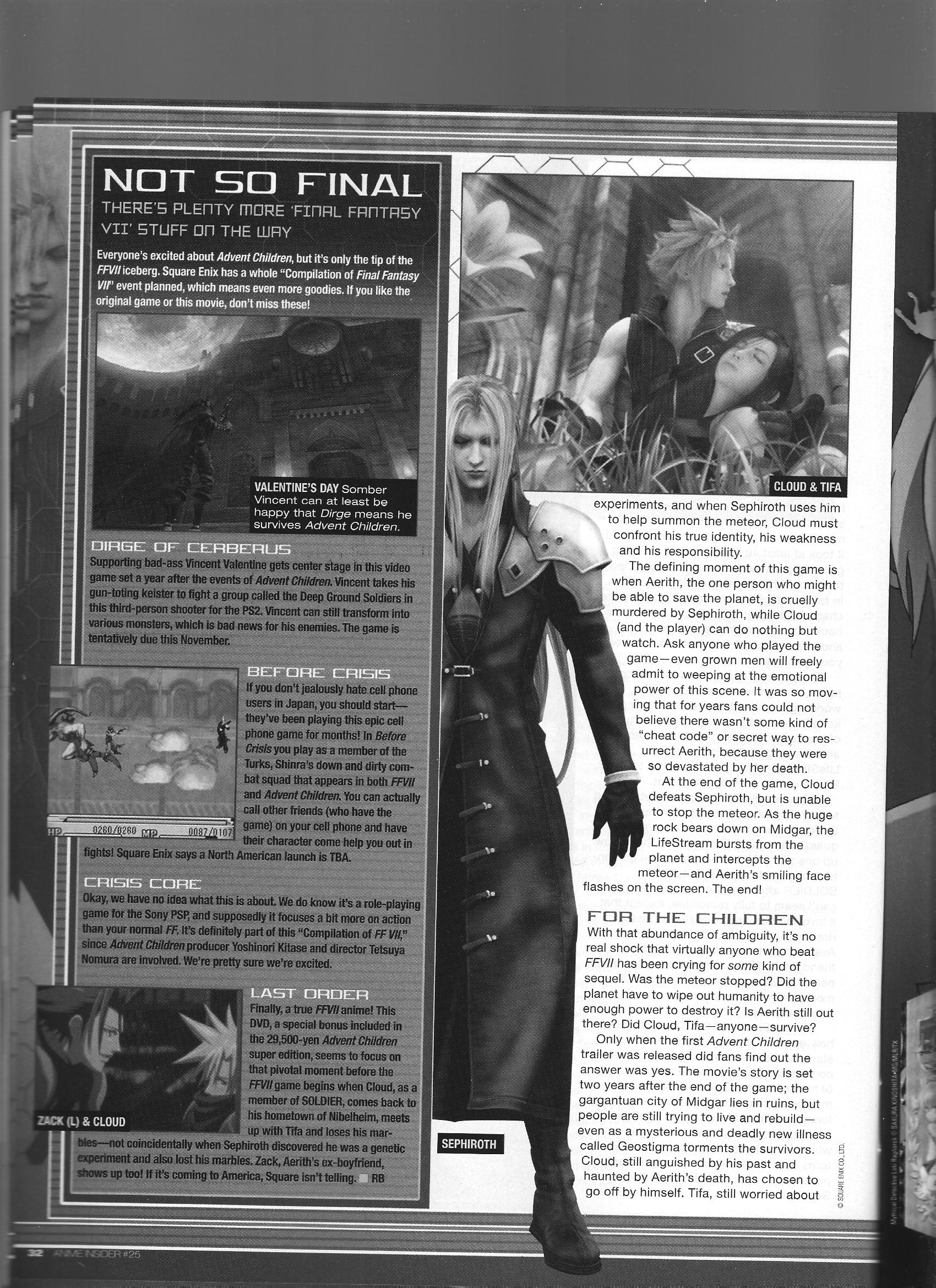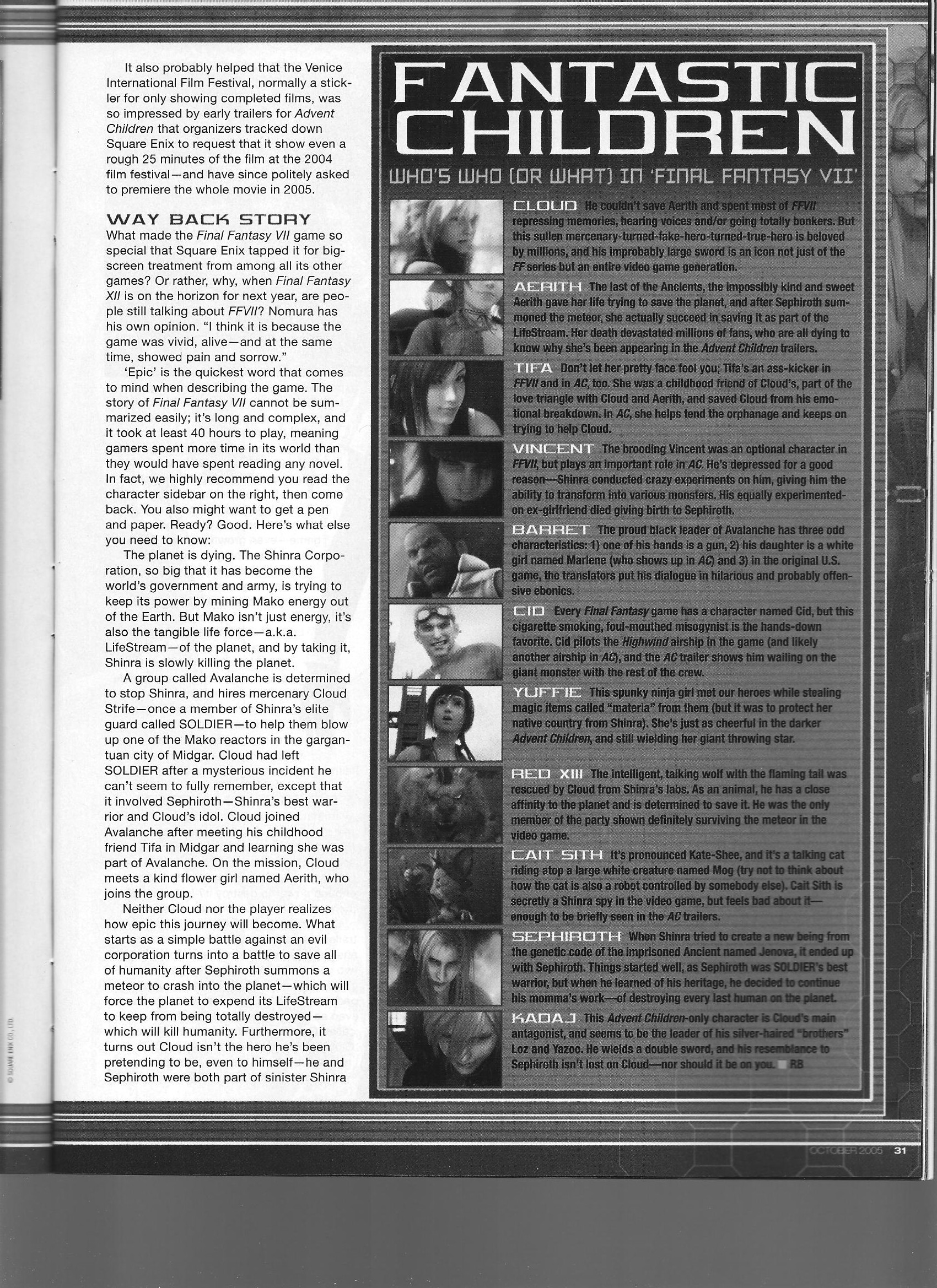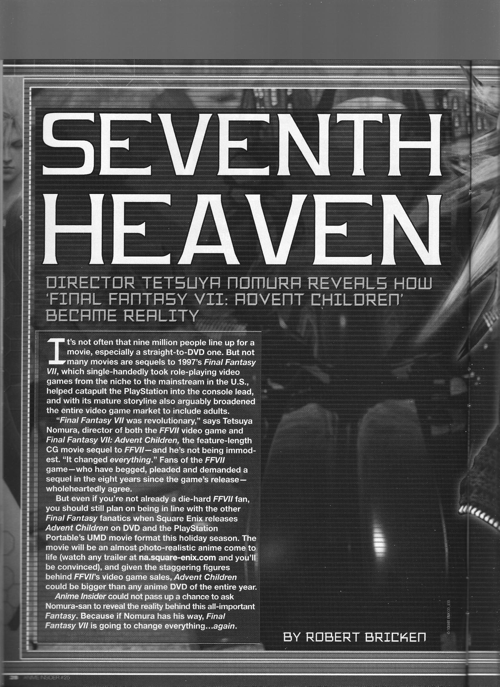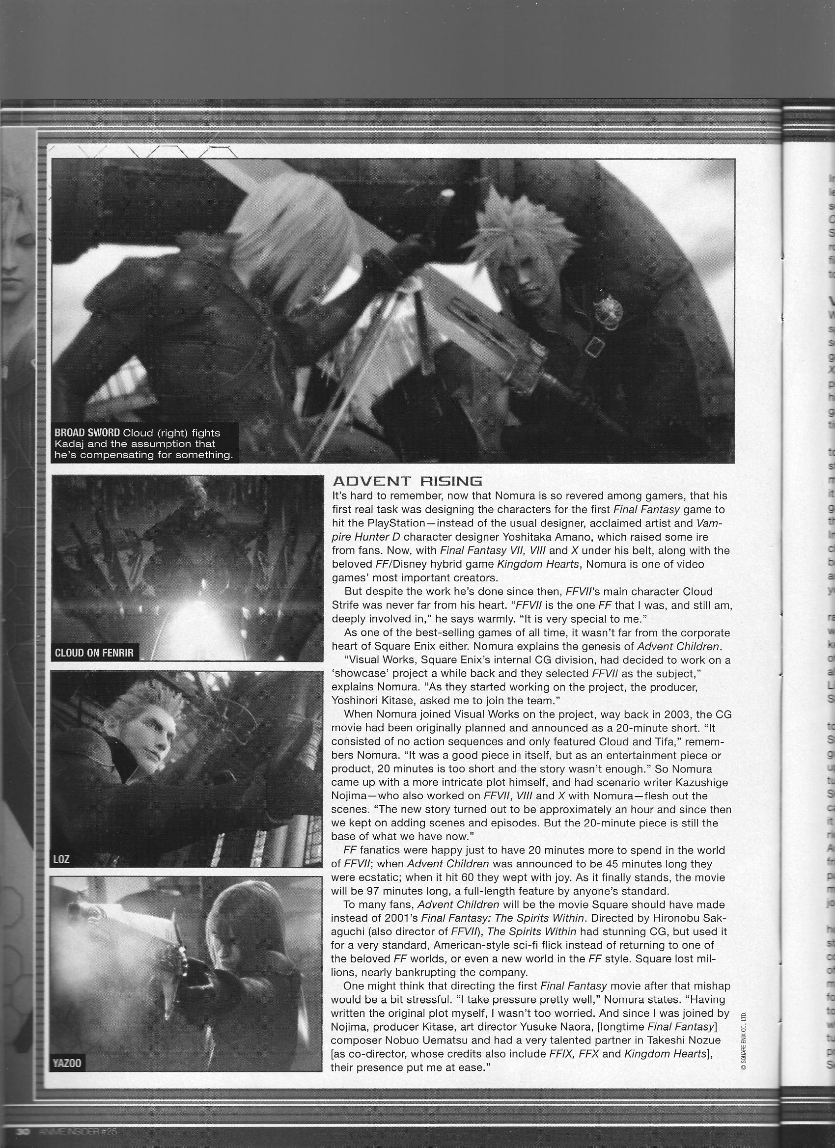Via Anime Insider: Tetsuya Nomura (October 2005) Posted on July 13, 2014 by torisunanohokori FF7 Advent Children Director Testuya Nomura talks about how the project evolved from a 20-minute short to a 97-minute movie. Share this: Click to share on X (Opens in new window) X Click to share on Facebook (Opens in new window) Facebook Like Loading...