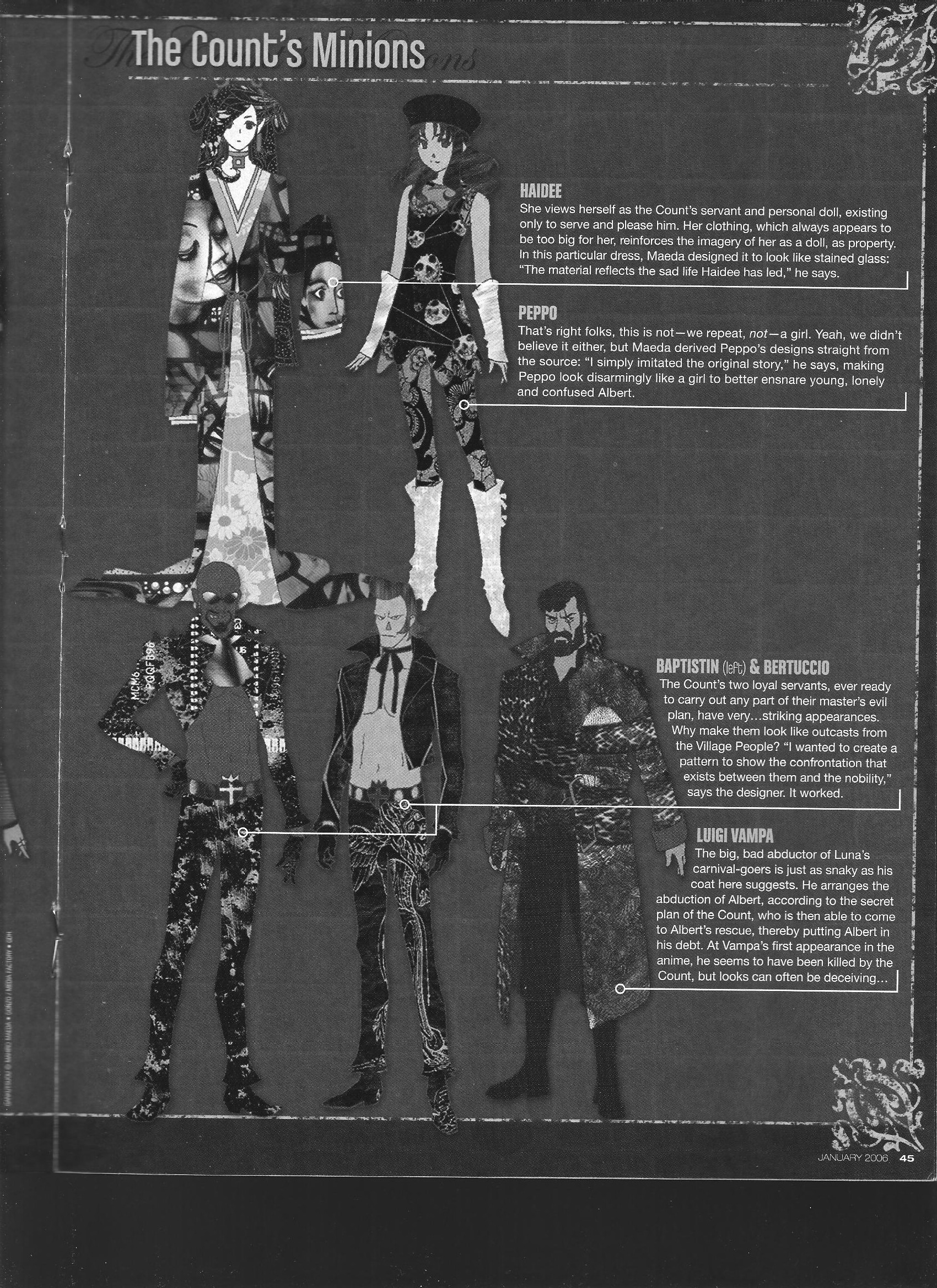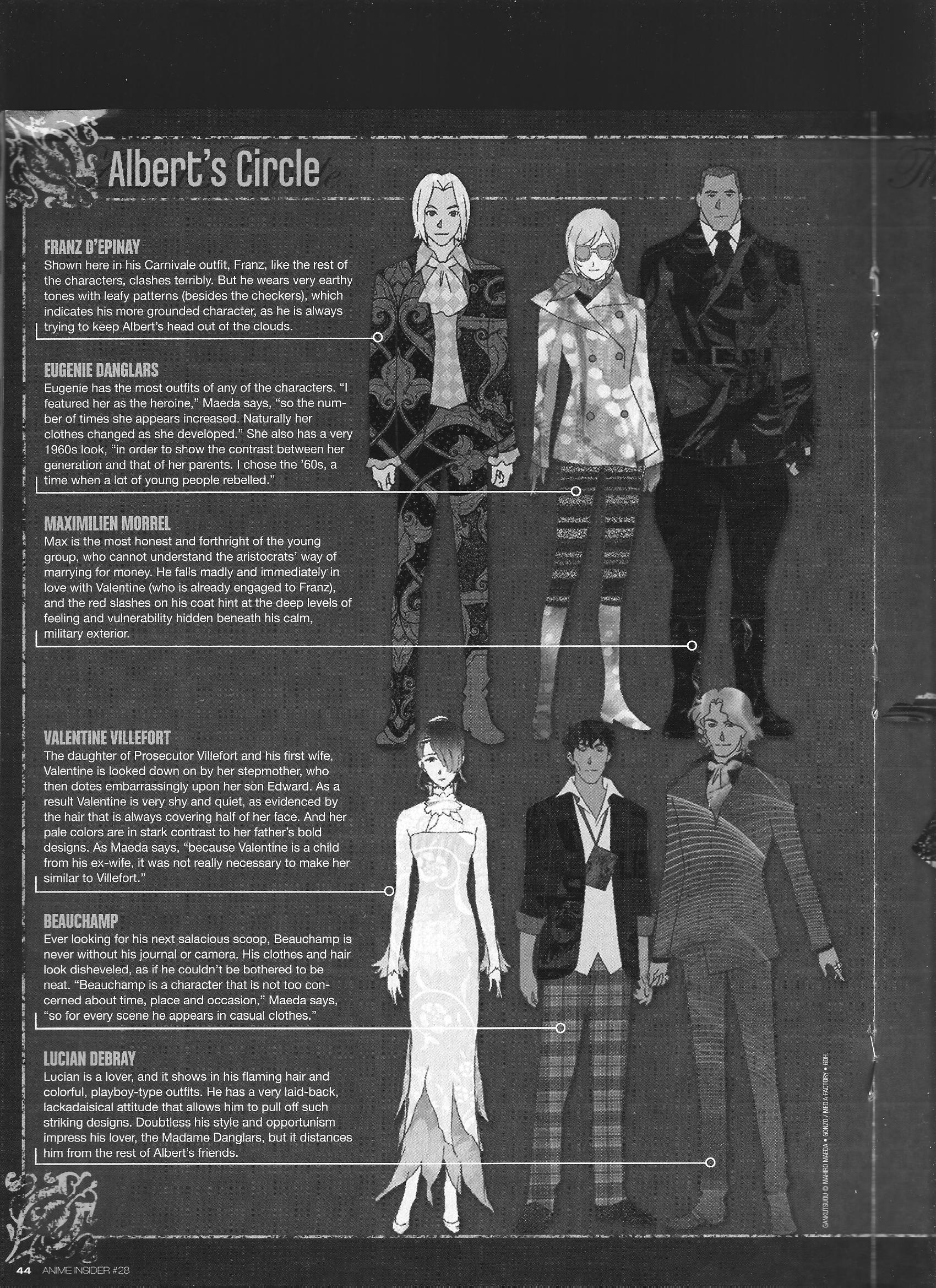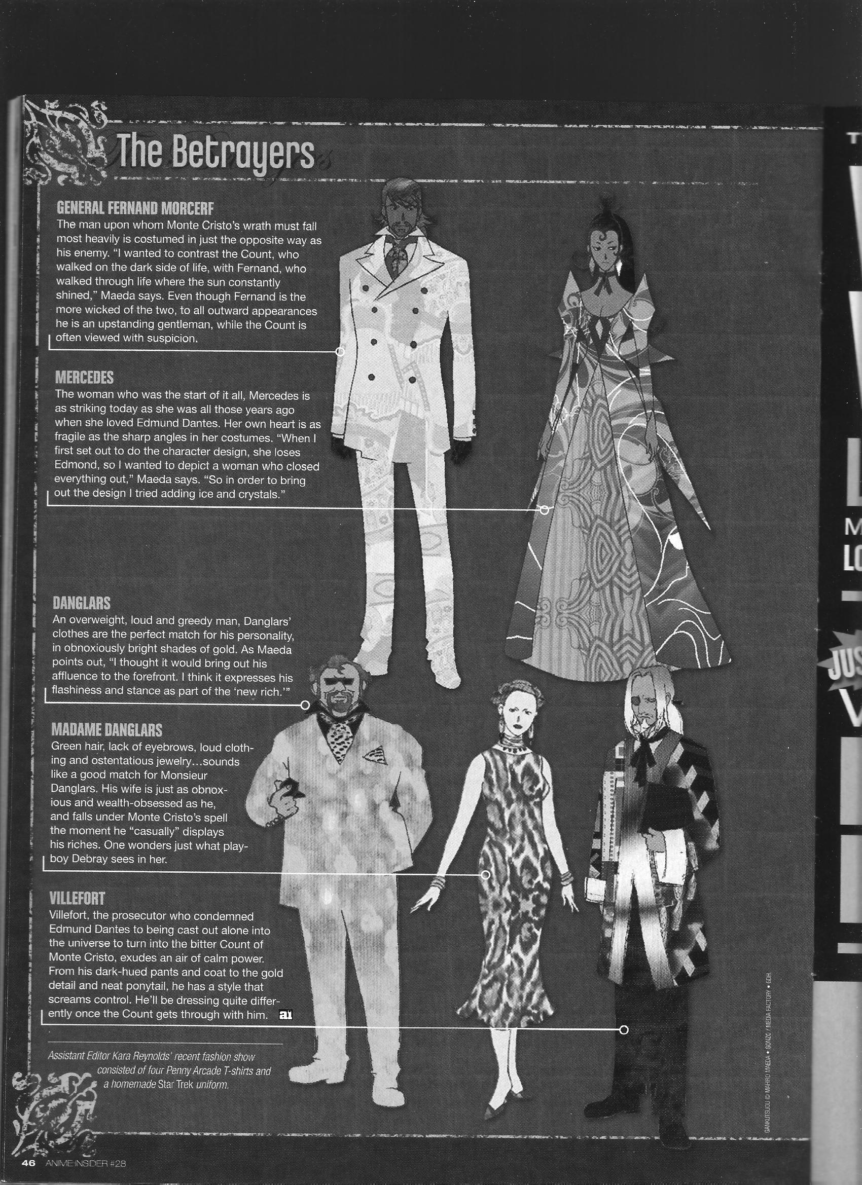 Via Anime Insider: Gankutsuou’s Character Designs (January 2006) Posted on July 15, 2014 by torisunanohokori Director/designer Mahiro Maeda talks about the character designs of Gankutsuou, Share this: Click to share on X (Opens in new window) X Click to share on Facebook (Opens in new window) Facebook Like Loading...