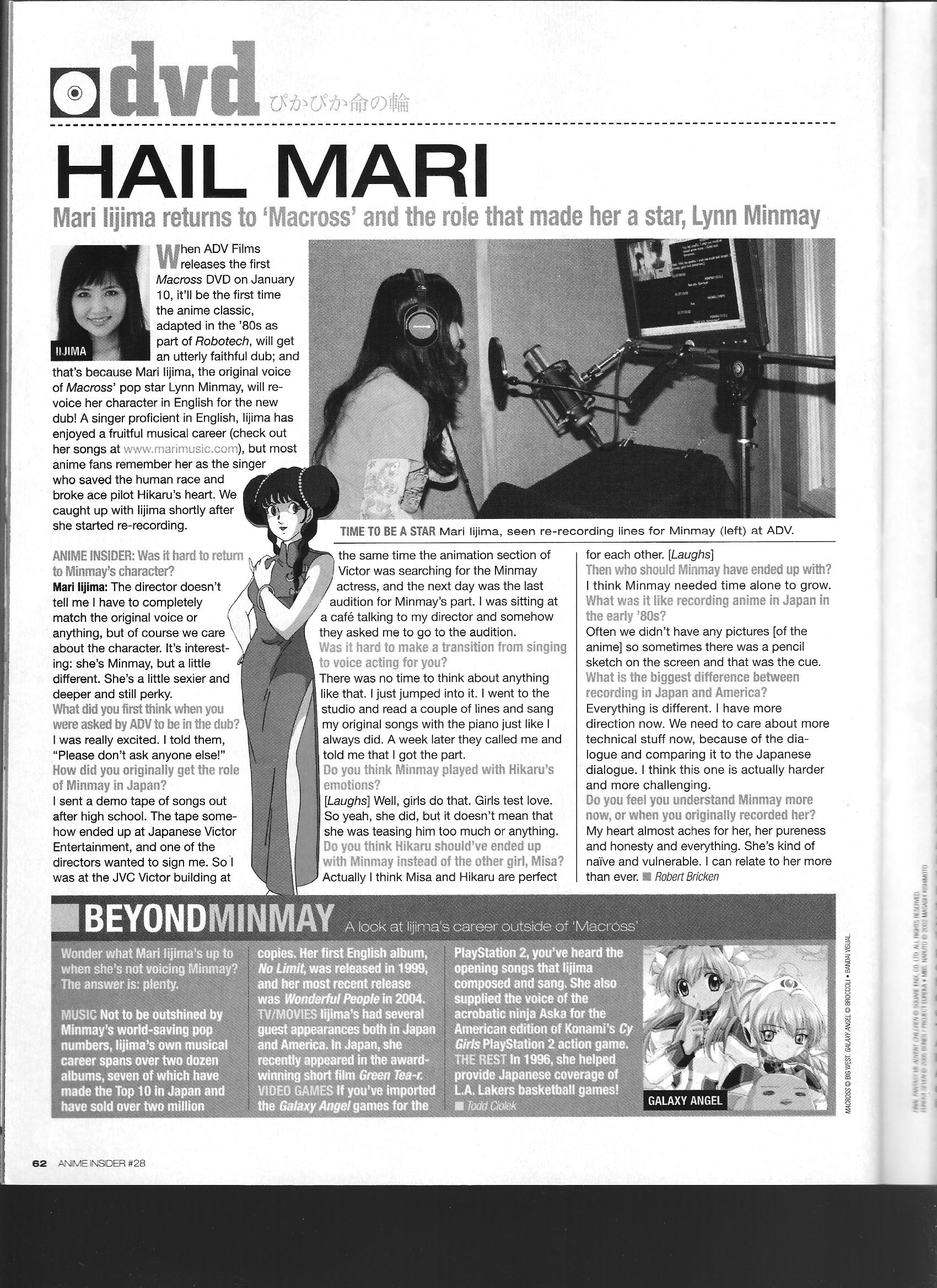 Via Anime Insider: Mari Iijima (January 2006) Posted on July 15, 2014 by torisunanohokori Short interview with Mari Iijima where she talks about getting back into character as Minmay for the 2006 Macross dub. Share this: Click to share on X (Opens in new window) X Click to share on Facebook (Opens in new window) Facebook Like Loading...