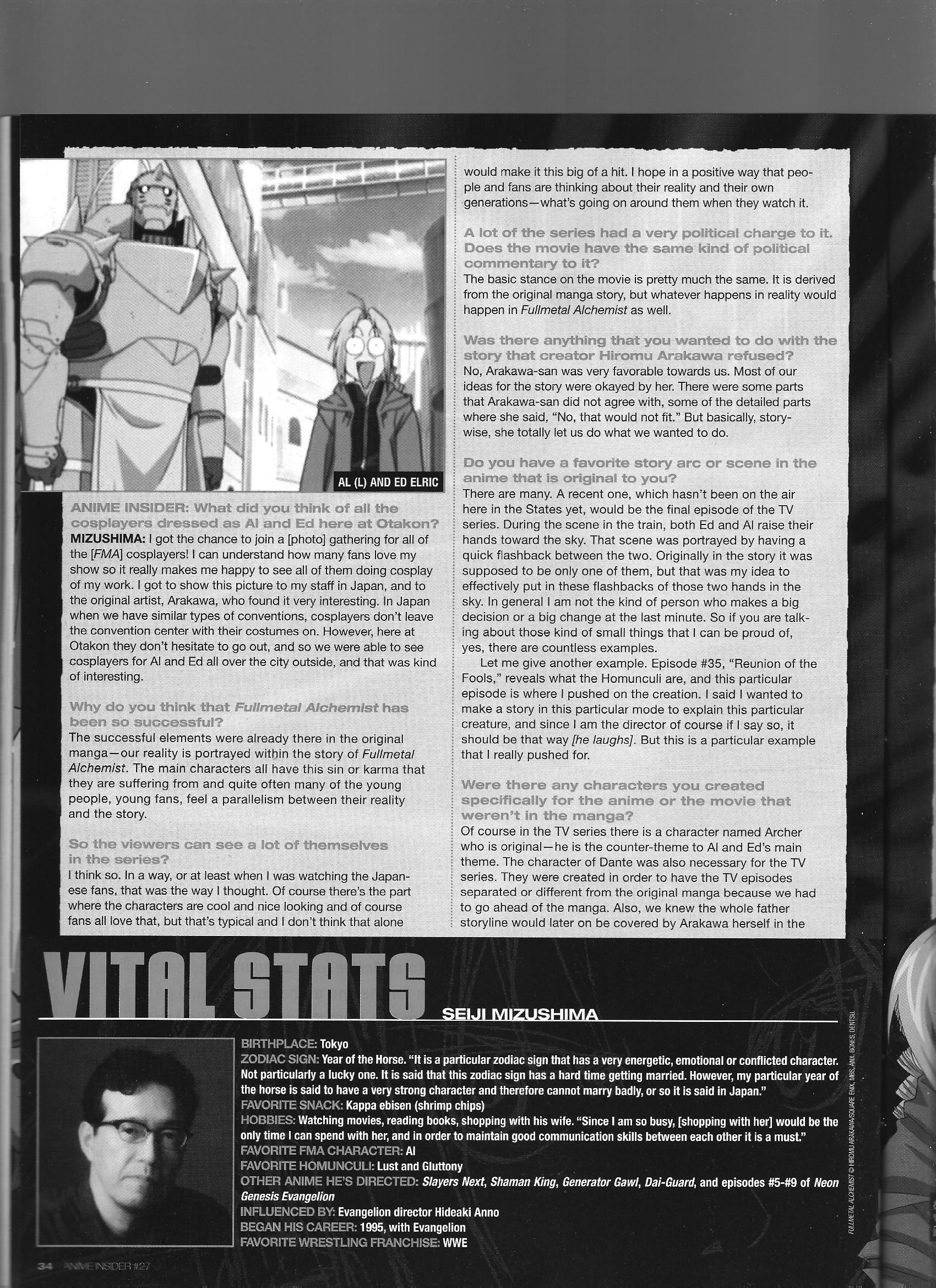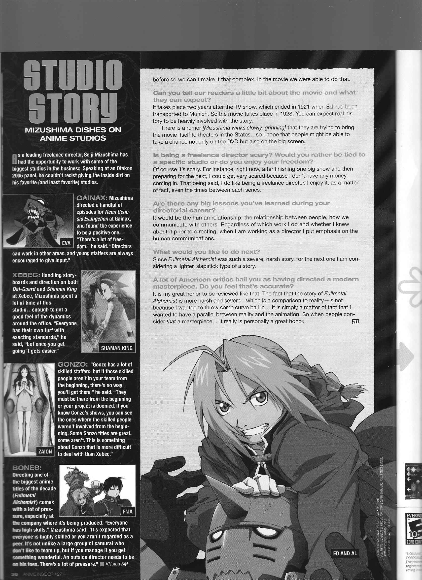 Via Anime Insider: Seiji Mizushima (December 2005) Posted on July 15, 2014 by torisunanohokori Director Seiji Mizushima talks about the FMA movie and being a freelance director. Share this: Click to share on X (Opens in new window) X Click to share on Facebook (Opens in new window) Facebook Like Loading...